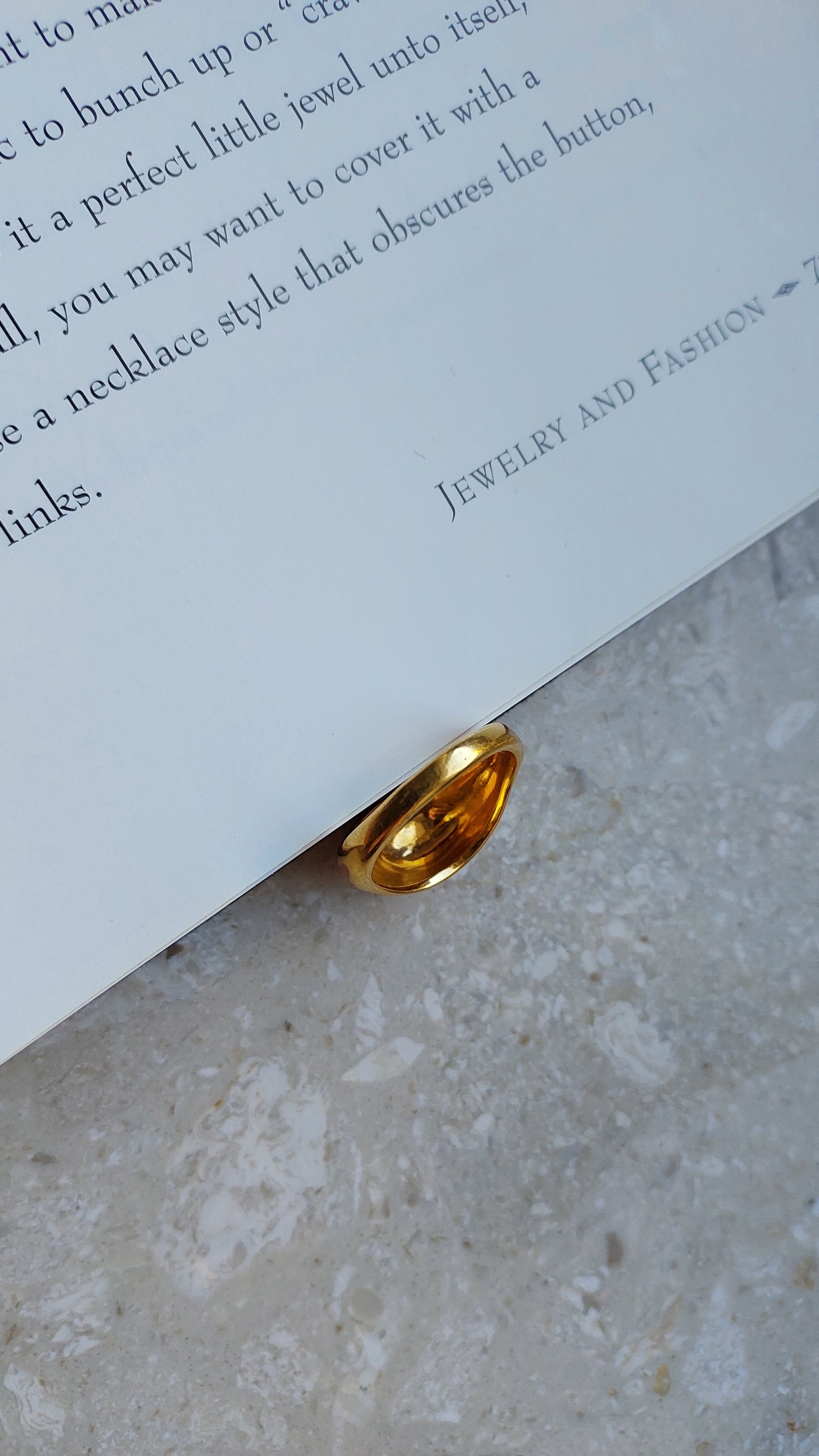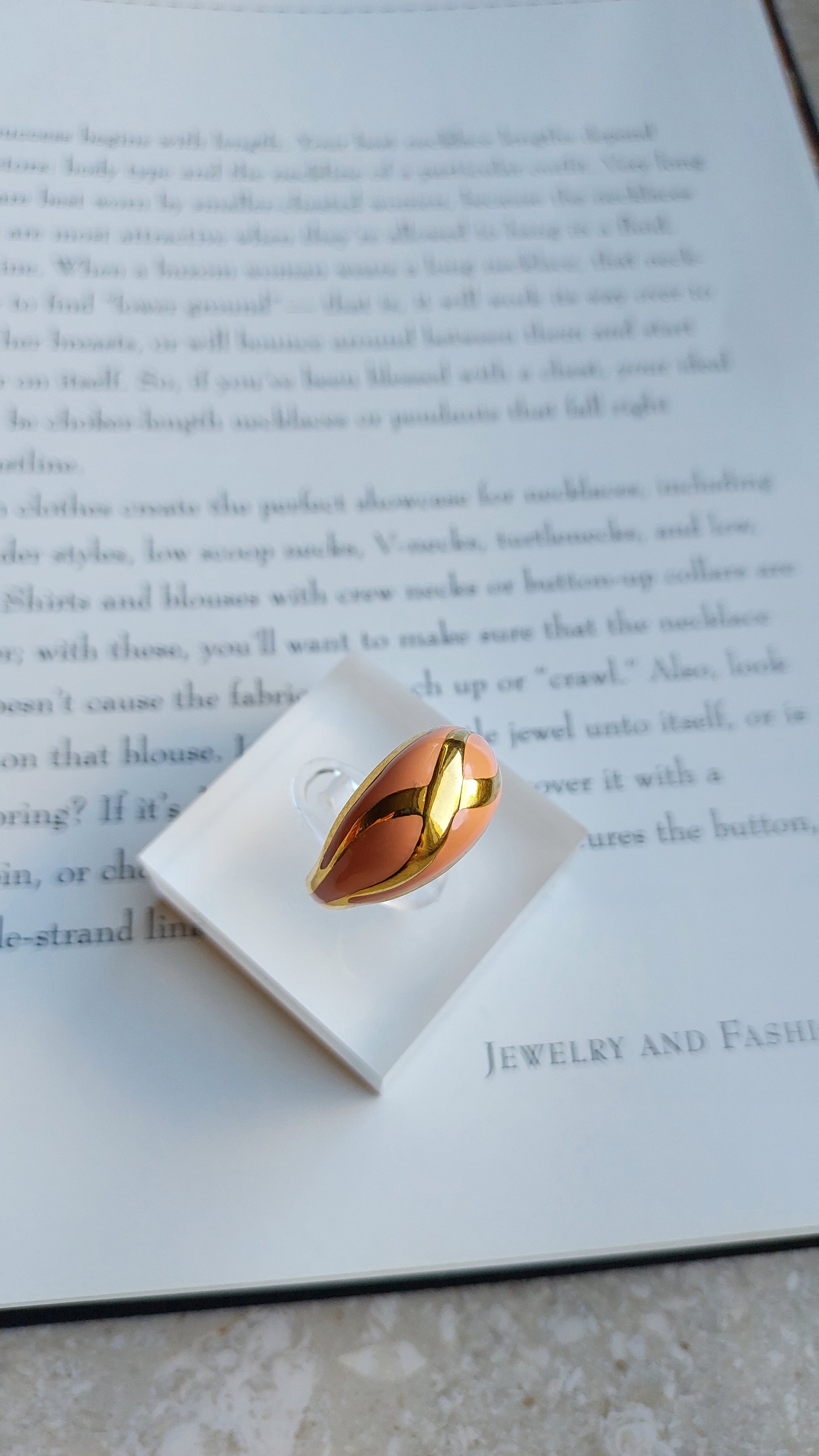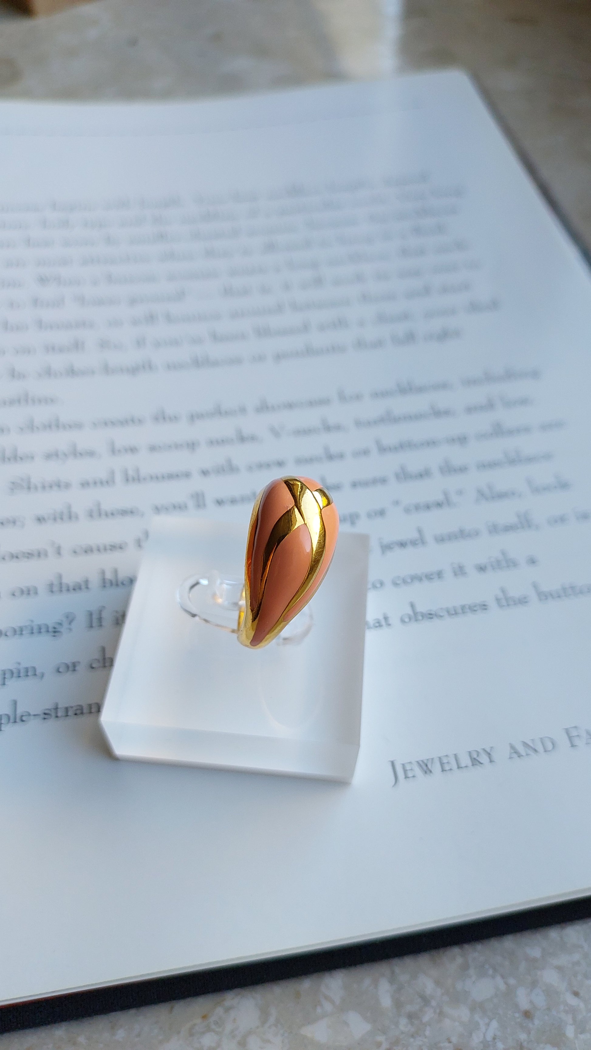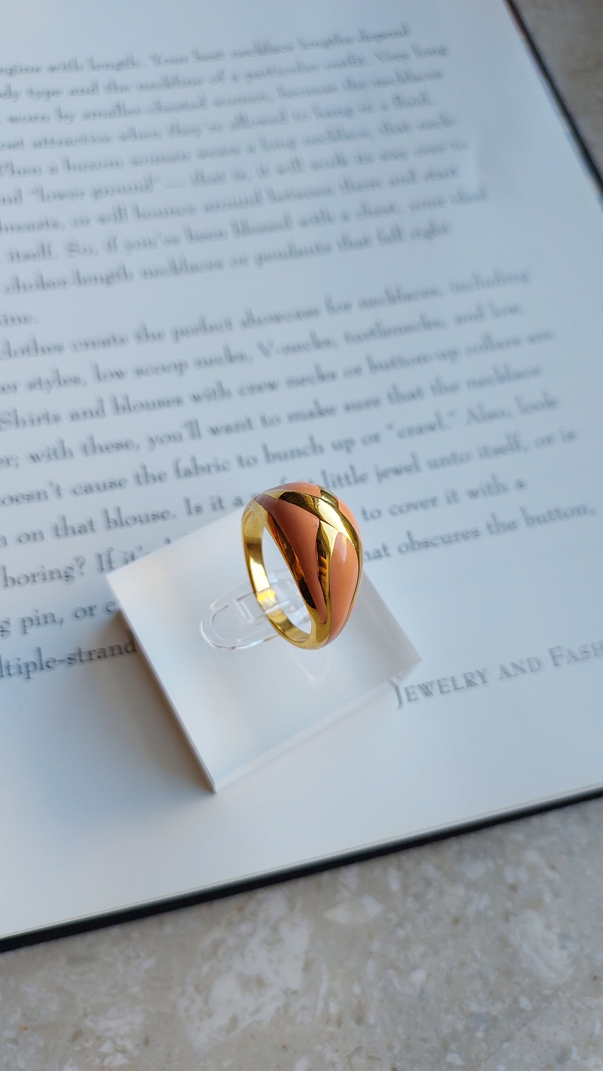 Pierścionek vintage Avon z lat 80–90., wykonany w eleganckim i minimalistycznym stylu. Ma wypukły, kopułowy kształt z gładką powierzchnią. Design łączy złoconą bazę z delikatną emalią w brzoskwiniowym odcieniu, ozdobioną subtelnym złotym wzorem w postaci przecinających się linii. W doskonałym stanie, wygodny, o opływowym kształcie.