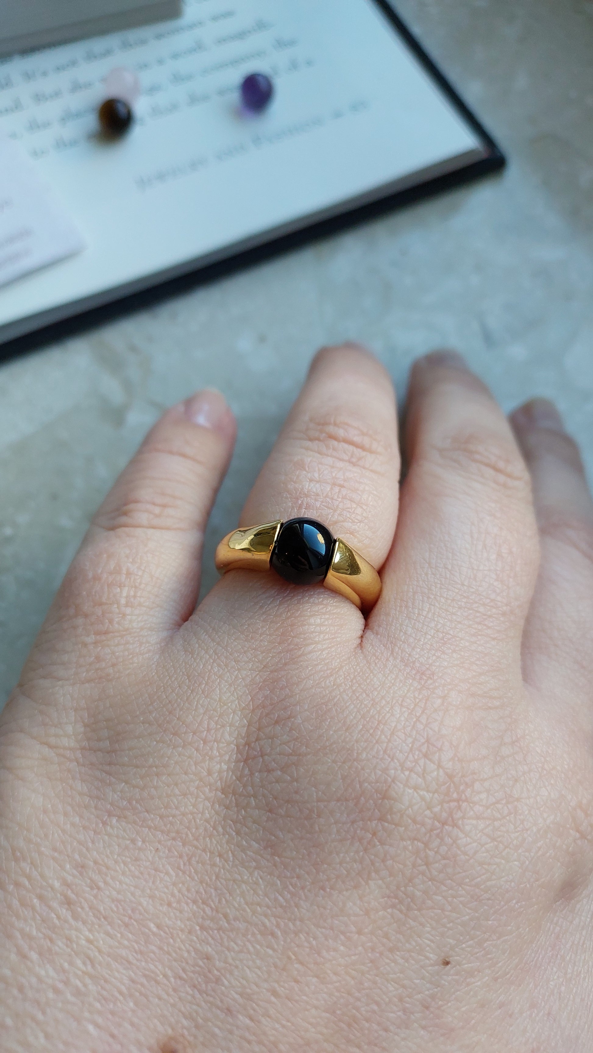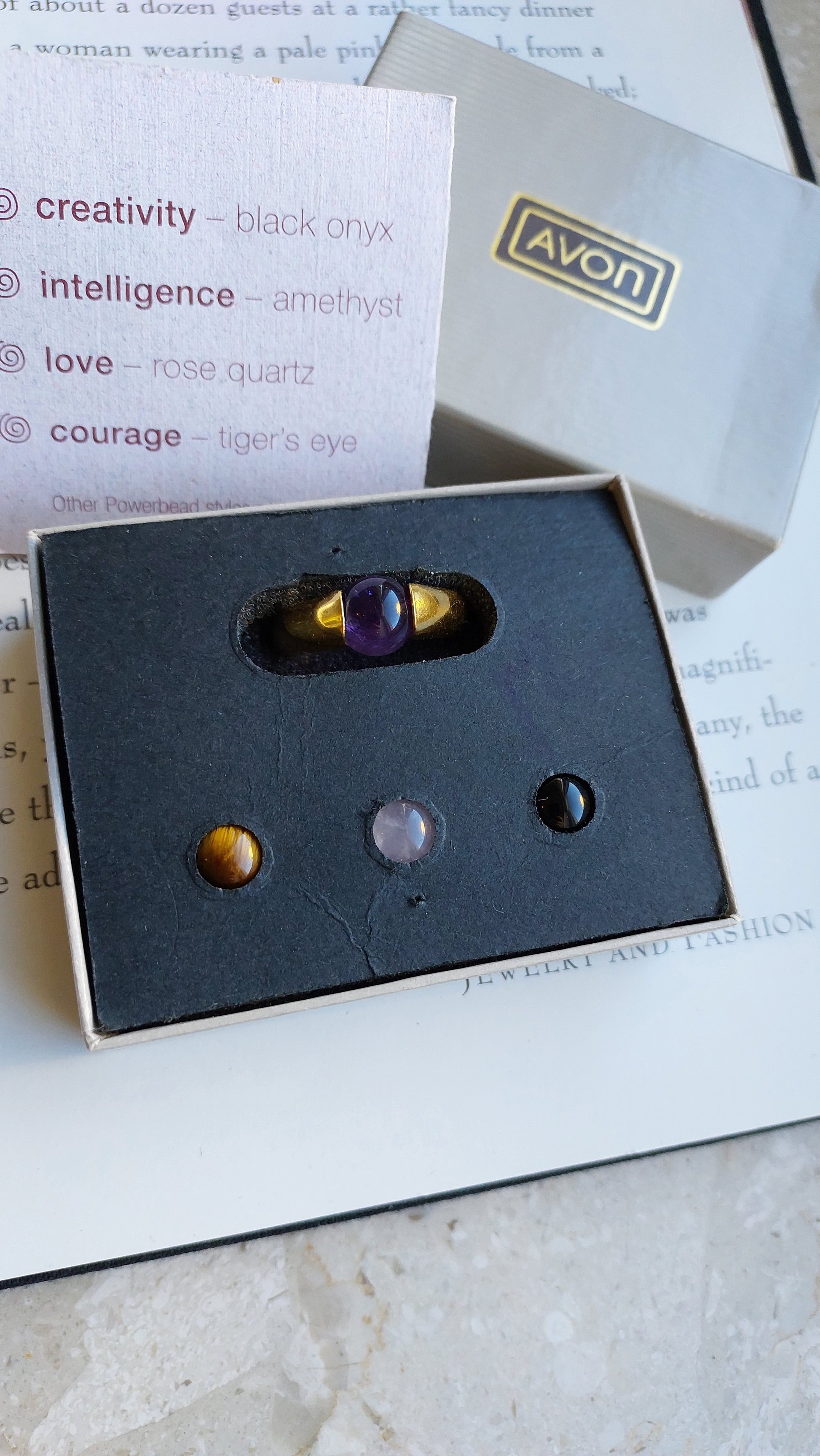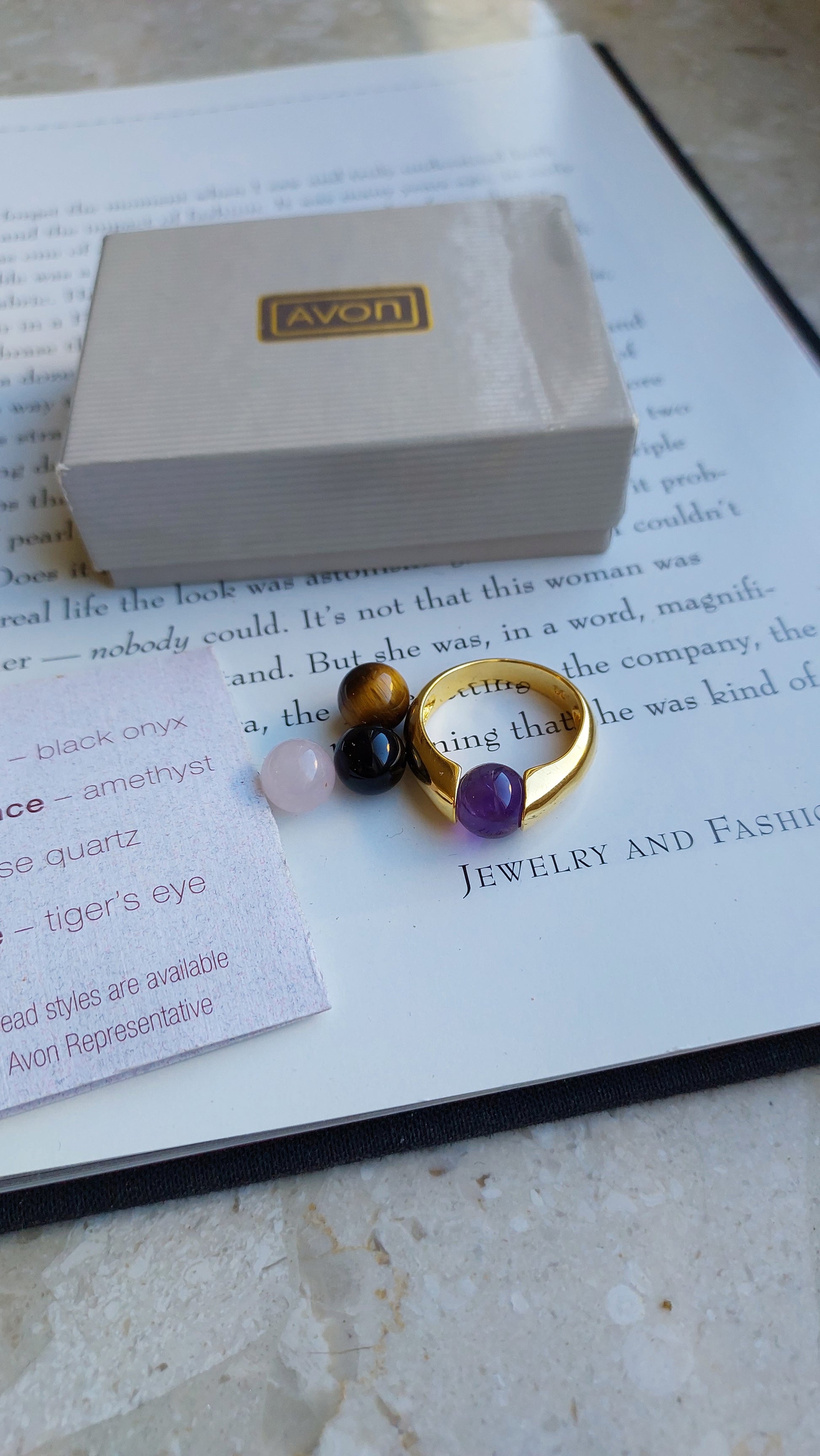 Pierścionek Avon ze zmiennymi elementami dekoracyjnymi to uniwersalna ozdoba, pozwalająca łatwo dopasować styl do okazji. Obrączka wykonana jest z metalu pokrytego ciepłym, złocistym wykończeniem, a w zestawie znajdują się cztery naturalne kamienie: ametyst o głębokim fioletowym odcieniu, czarny onyks, tygrysie oko z intensywnymi brązowo-złotymi refleksami oraz różowy kwarc o delikatnym, pastelowym zabarwieniu.