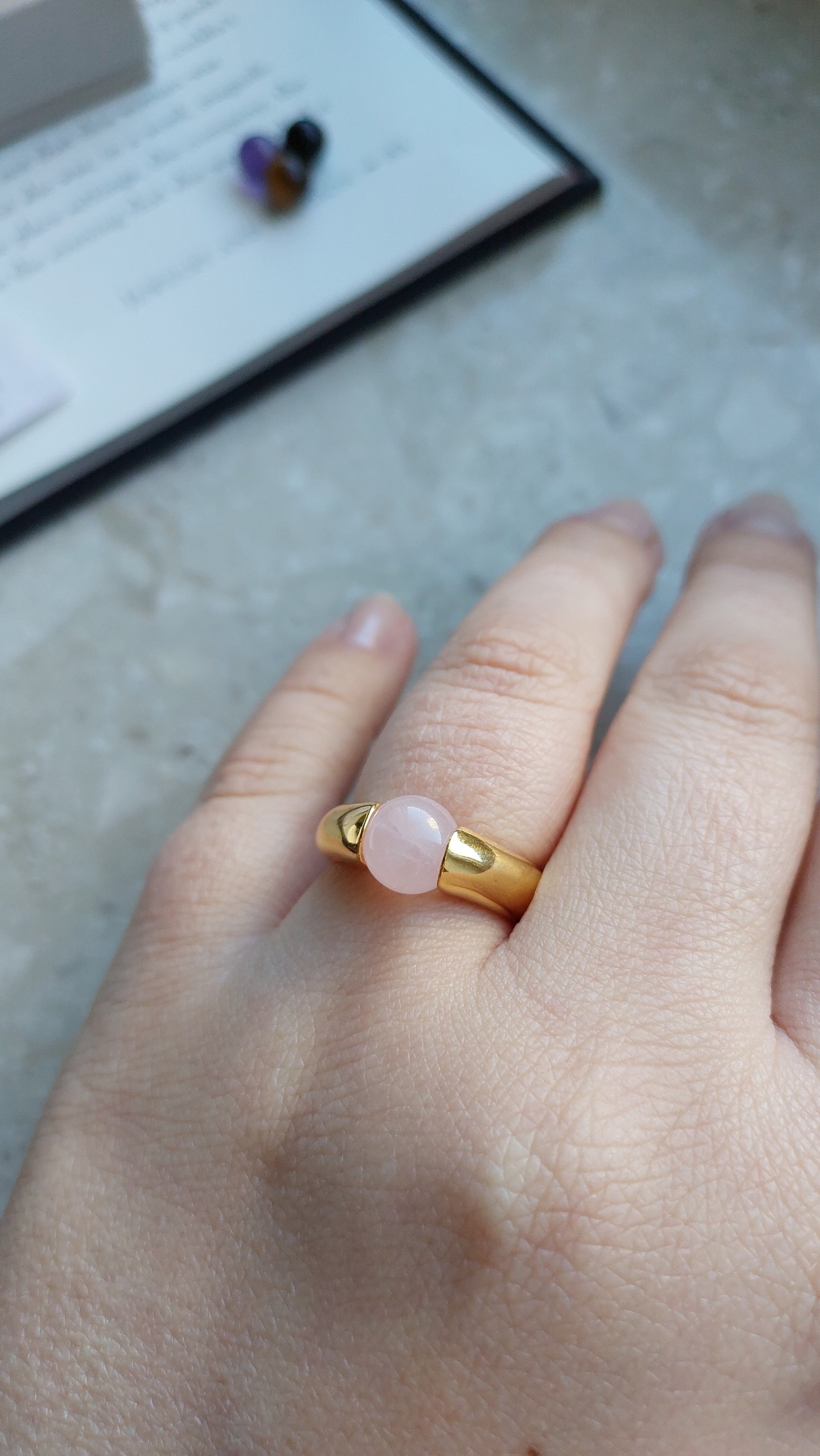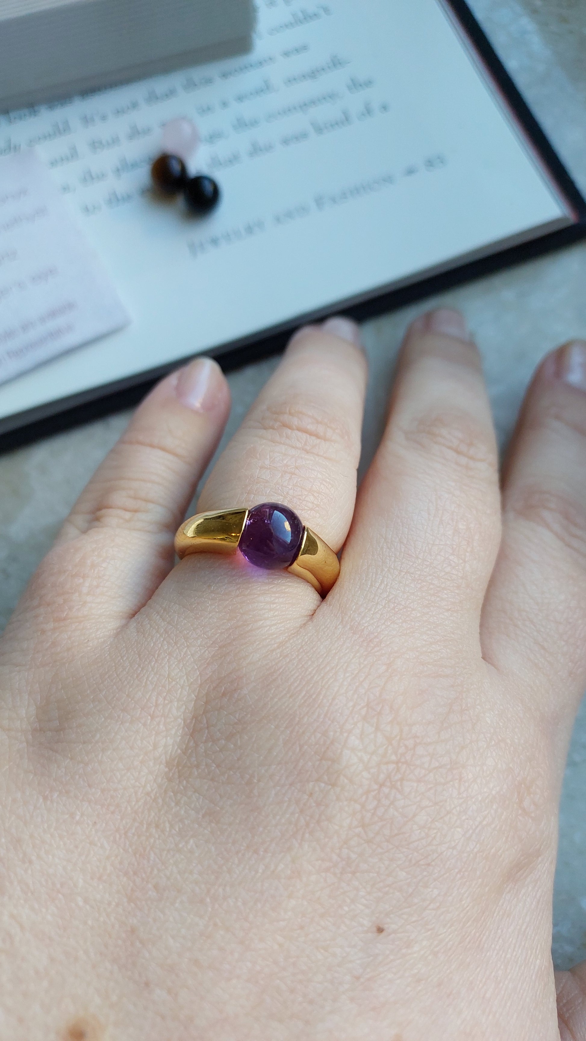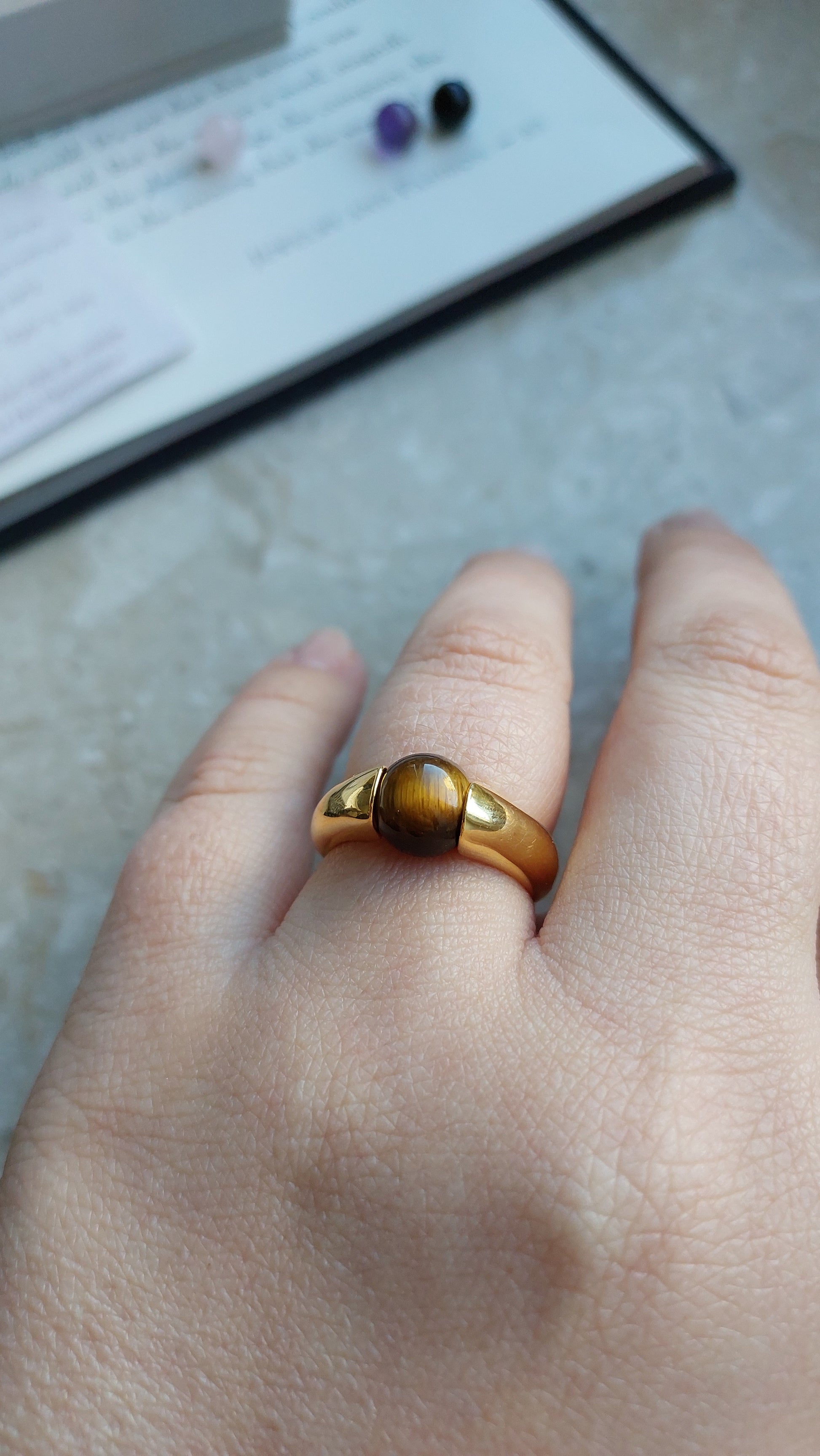 Pierścionek Avon ze zmiennymi elementami dekoracyjnymi to uniwersalna ozdoba, pozwalająca łatwo dopasować styl do okazji. Obrączka wykonana jest z metalu pokrytego ciepłym, złocistym wykończeniem, a w zestawie znajdują się cztery naturalne kamienie: ametyst o głębokim fioletowym odcieniu, czarny onyks, tygrysie oko z intensywnymi brązowo-złotymi refleksami oraz różowy kwarc o delikatnym, pastelowym zabarwieniu.