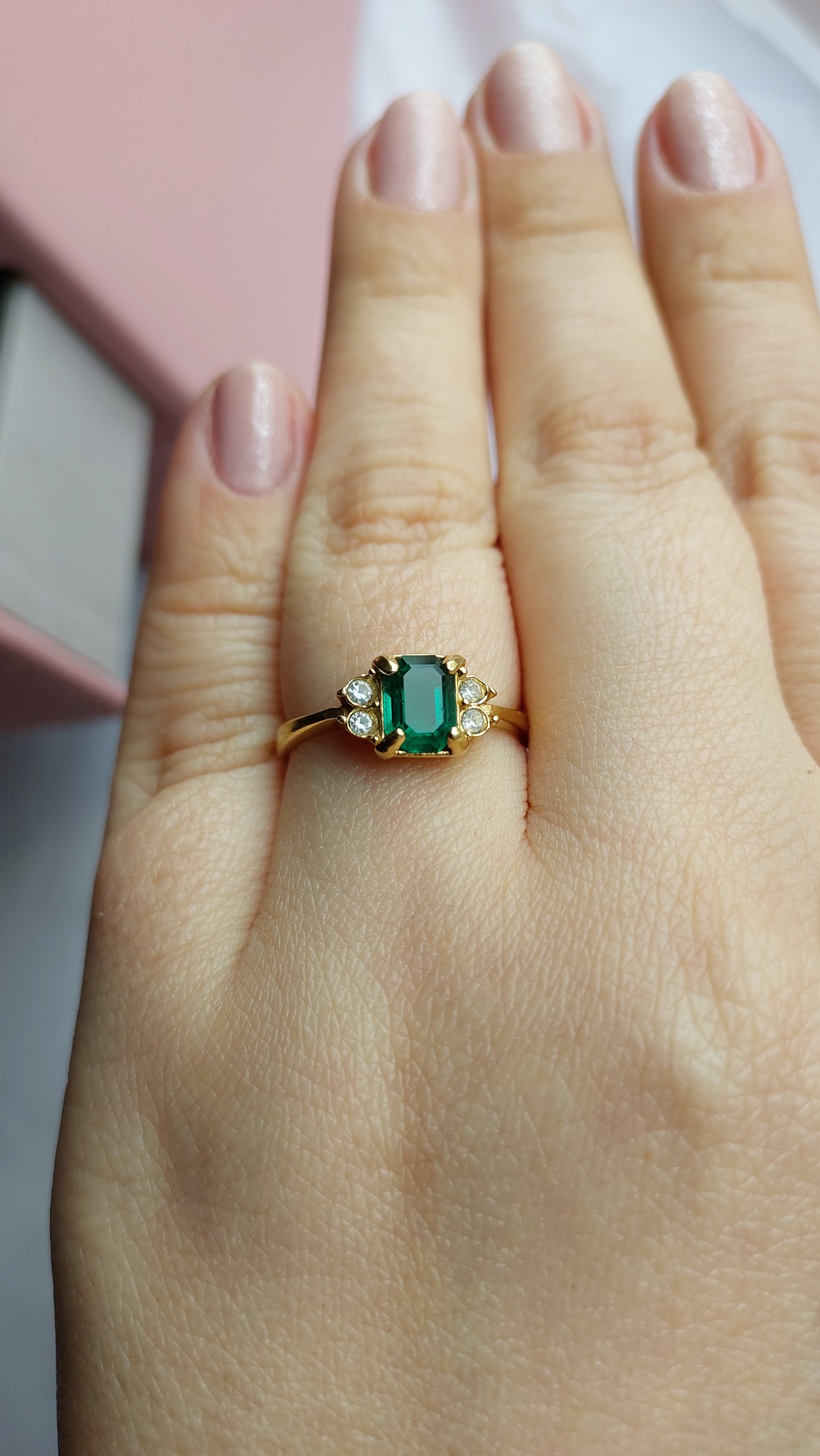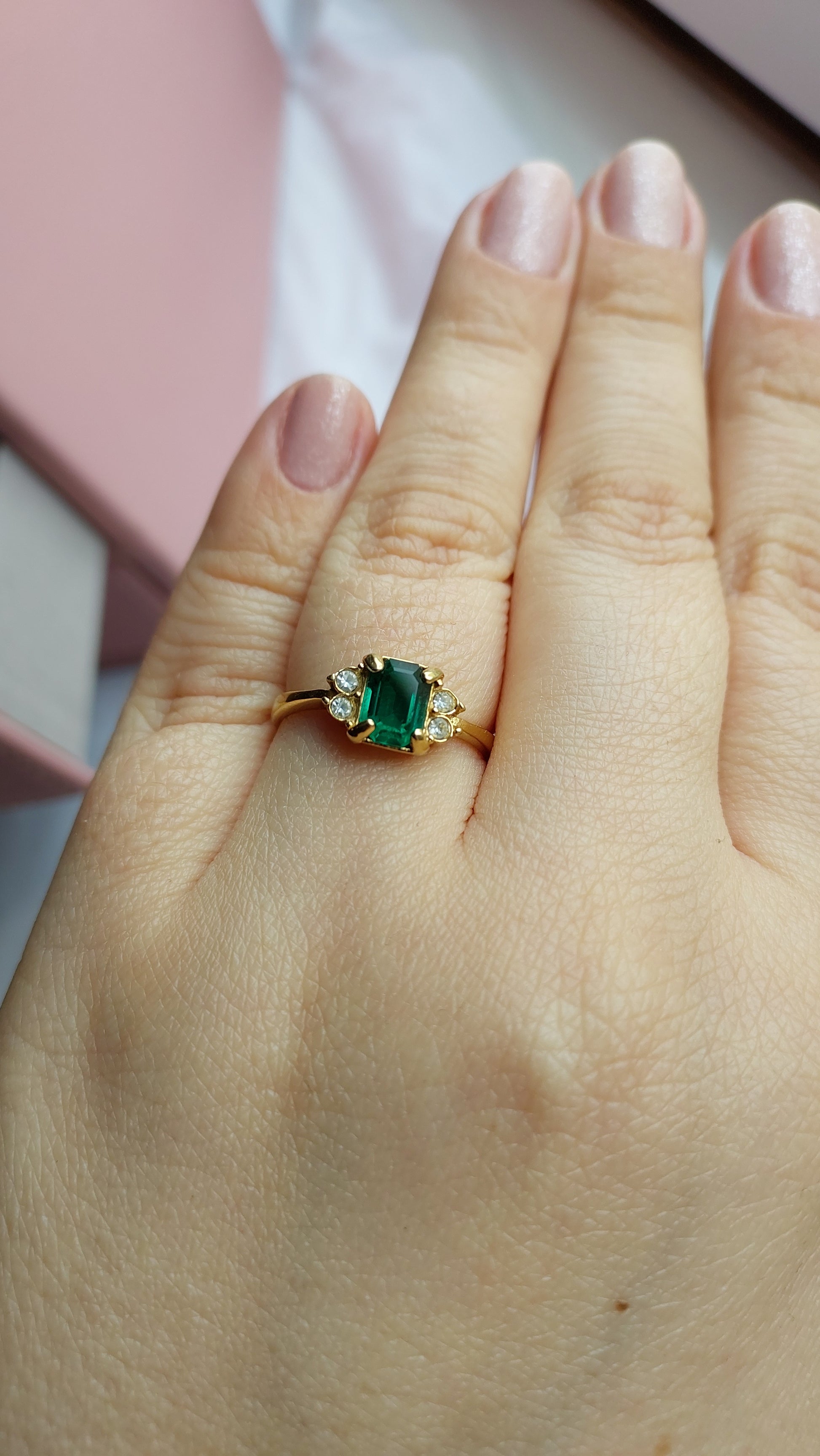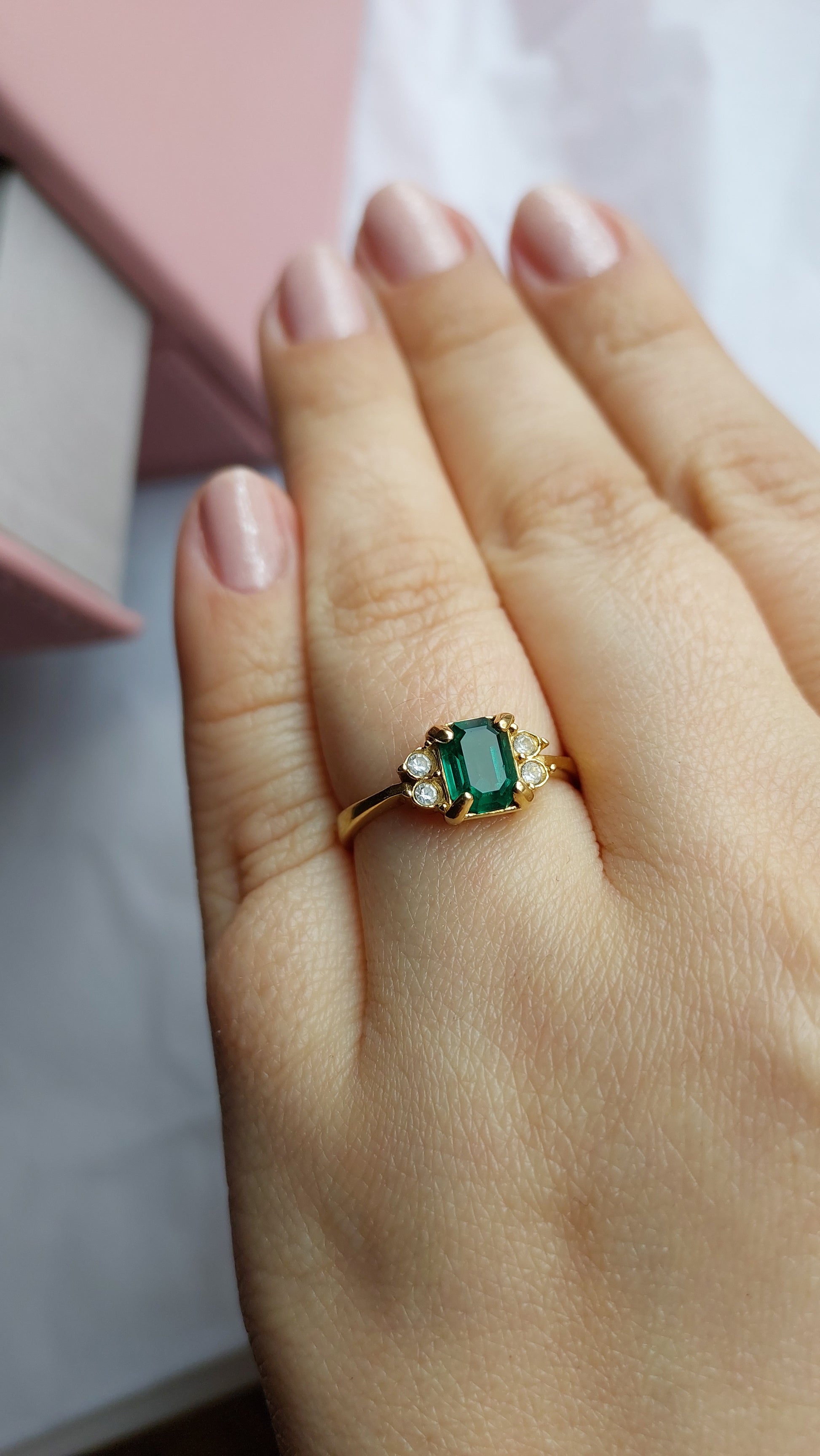 Pierścionek od Avon z szmaragdowo-zielonym kryształem w złocistej oprawie. Po obu stronach centralnego kamienia znajdują się niewielkie, przezroczyste kryształki, które dodają blasku i podkreślają szlachetny kolor głównego elementu. Pierścionek utrzymany jest w ciepłym, złotym tonie – delikatny i subtelny, a zarazem wystarczająco wyrazisty. W bardzo dobrym stanie. Rozmiar 17