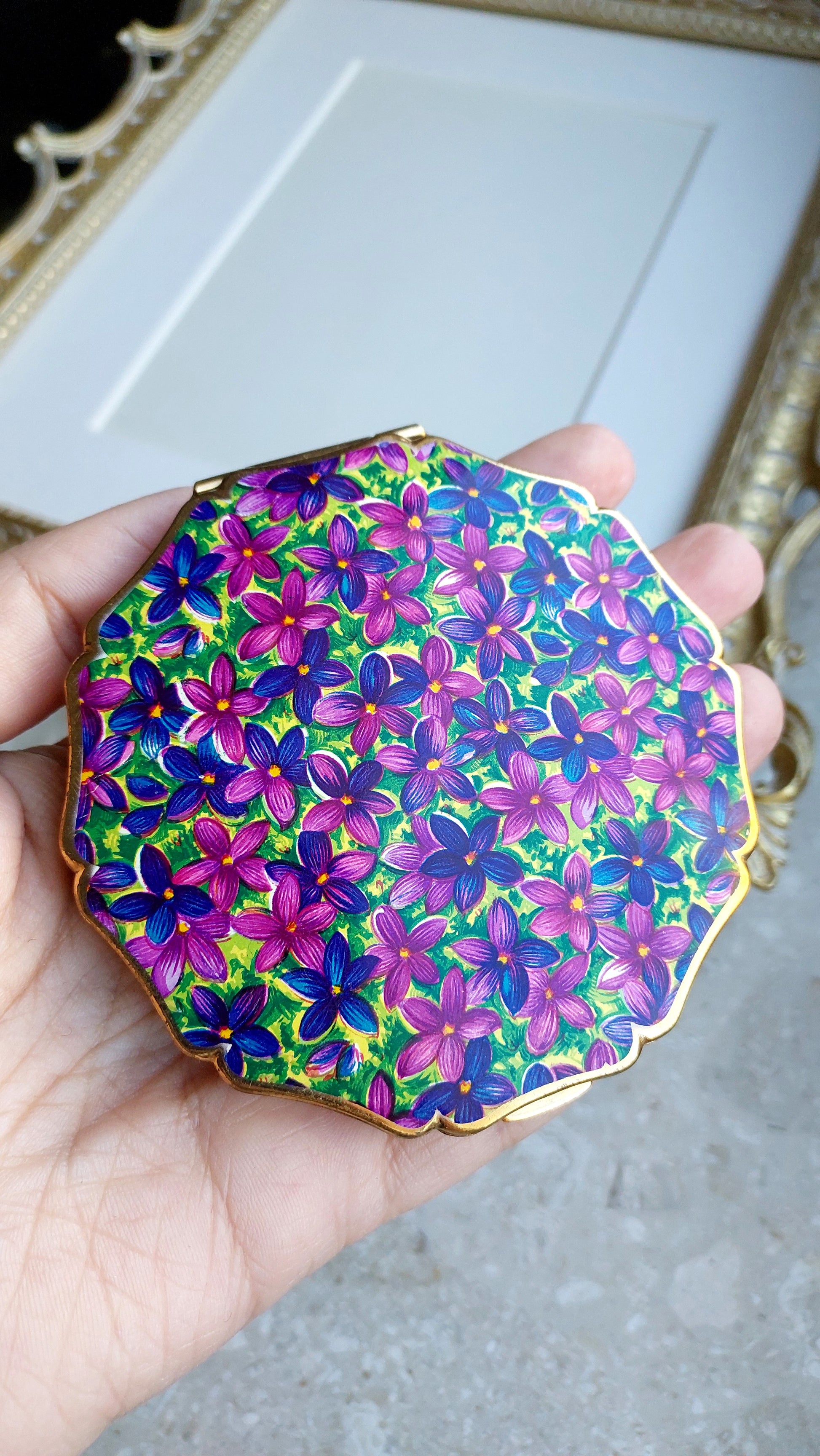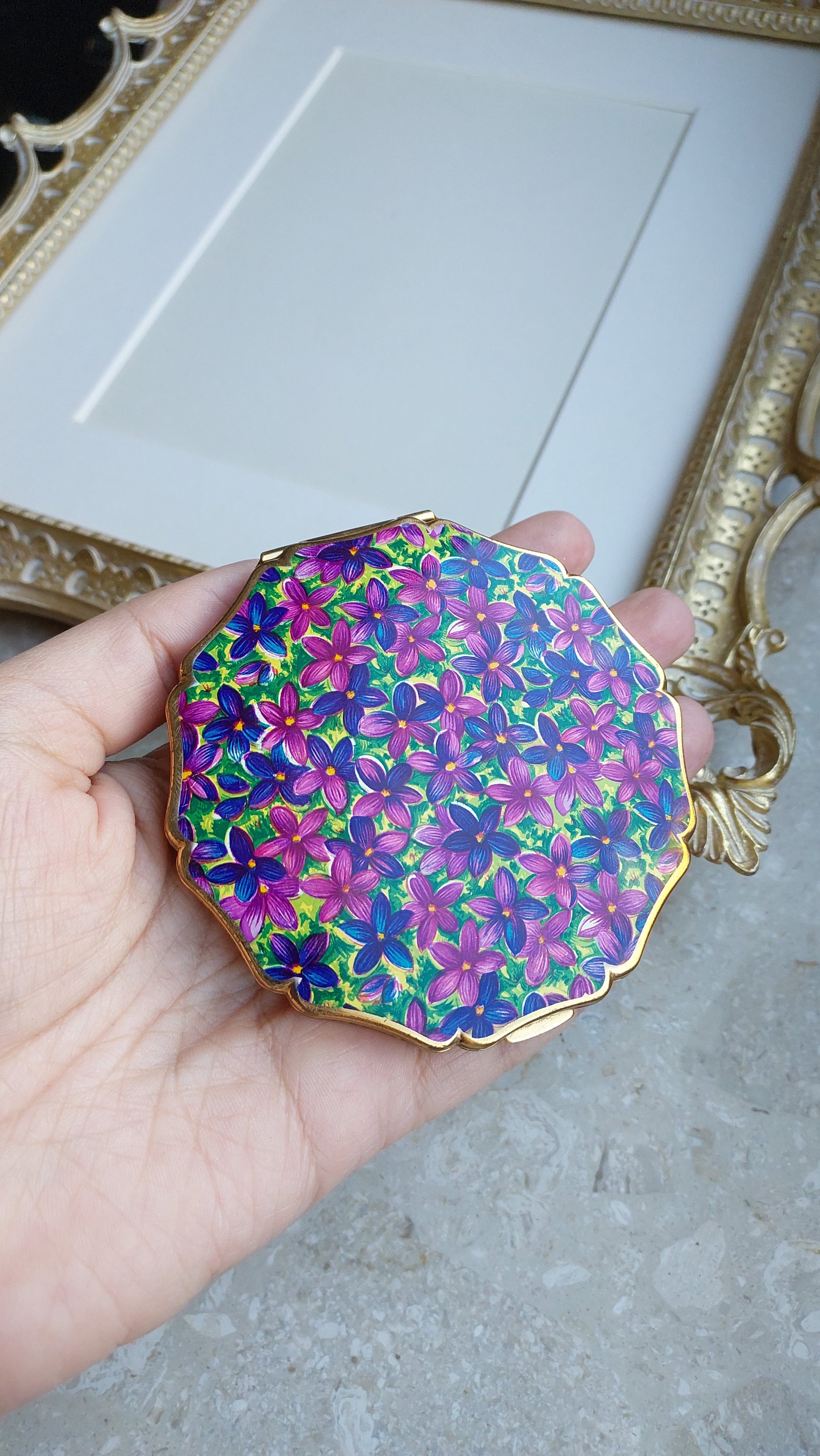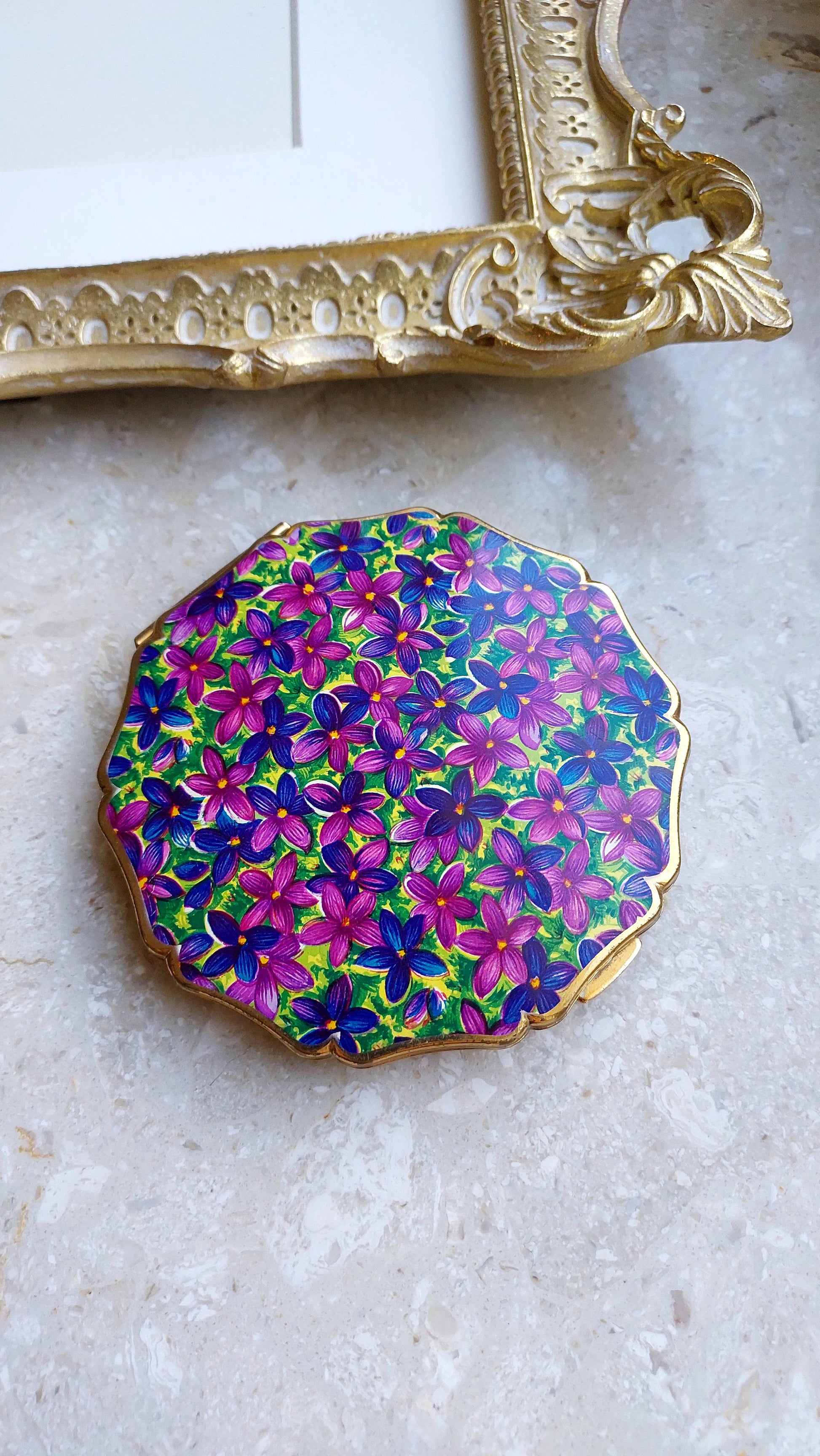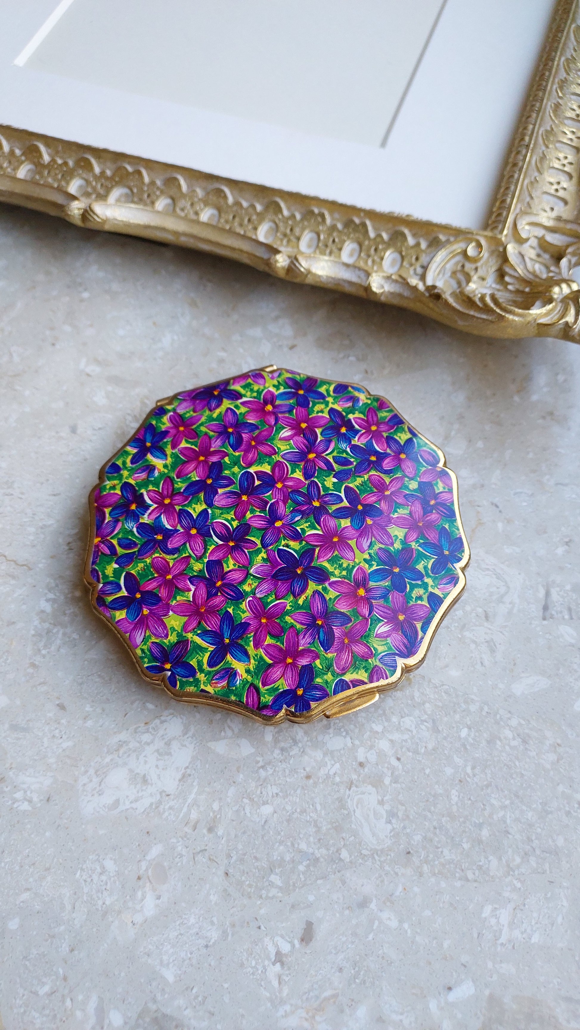 Puderniczka Stratton made in England — efektowna, kolekcjonerska i naprawdę wyjątkowa.Na wieczku znajduje się bogaty kwiatowy ornament w odcieniach purpury, fuksji i głębokiego granatu, malowany drobnymi pociągnięciami na intensywnie zielonym tle. Paleta jest bardzo wyrazista, z żywym, „emaliowym” połyskiem charakterystycznym dla prac Stratton z połowy XX wieku.