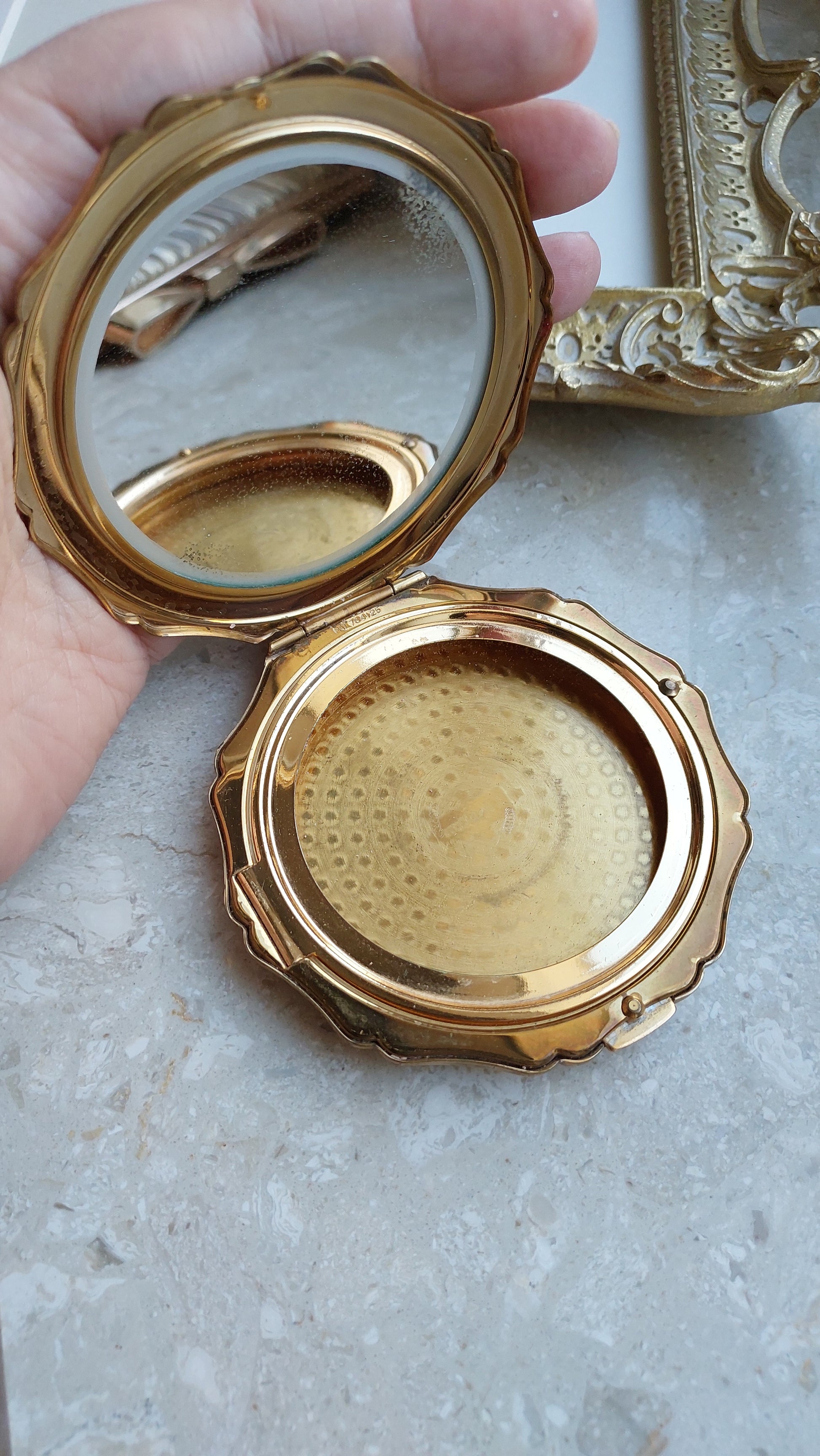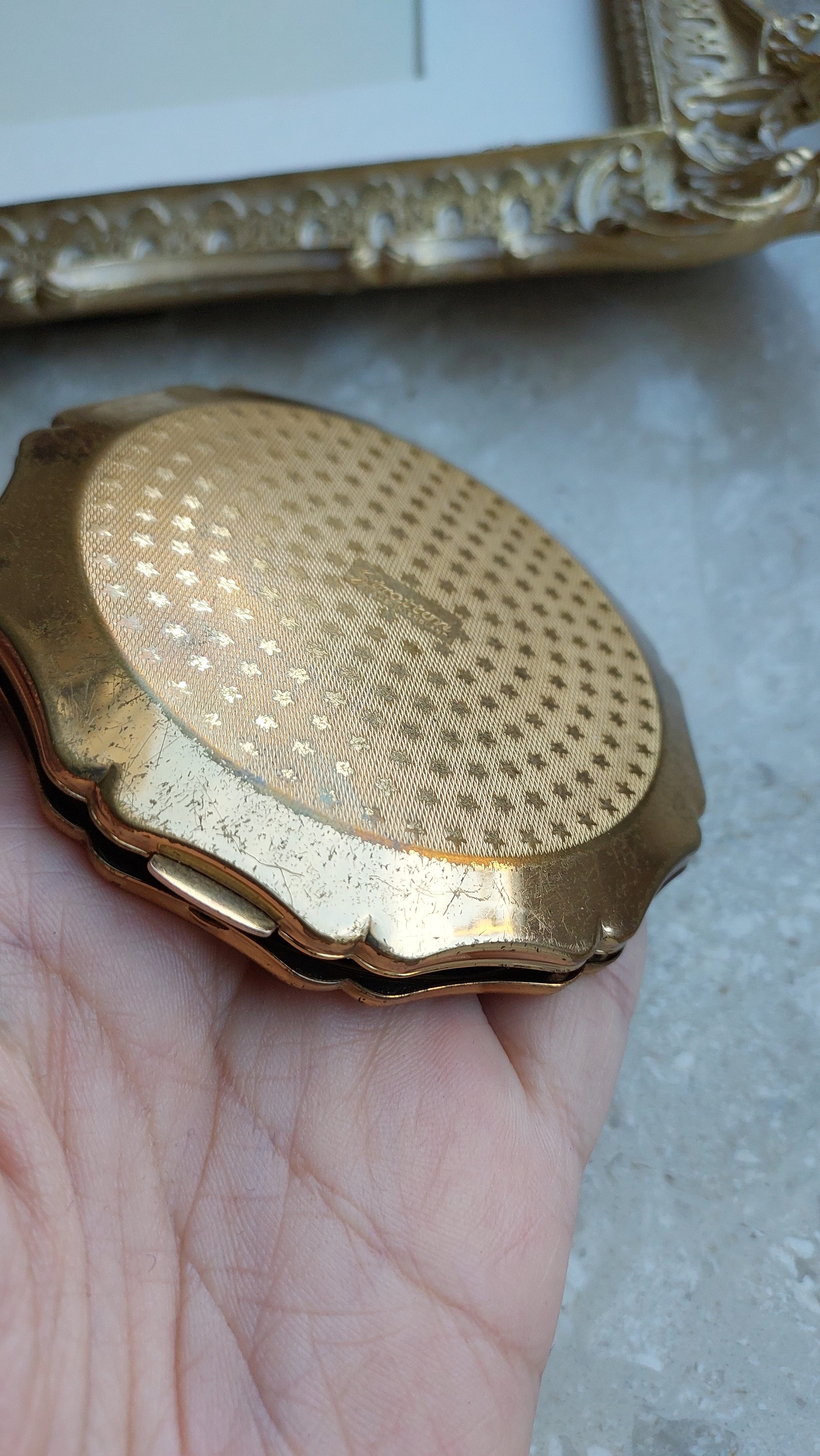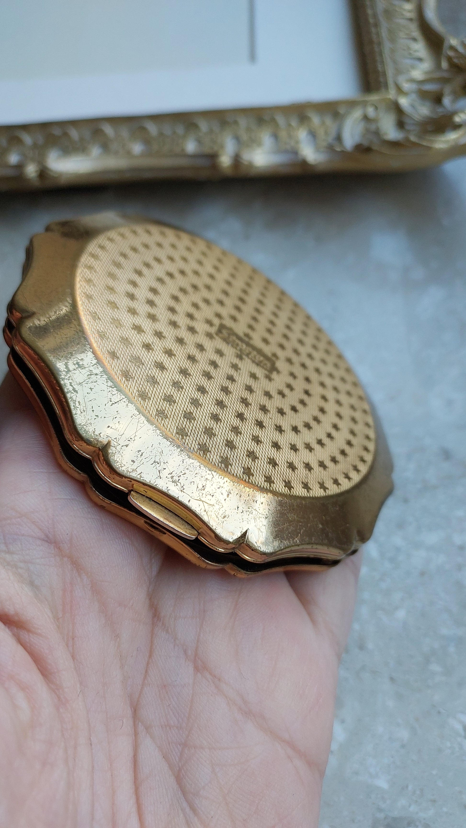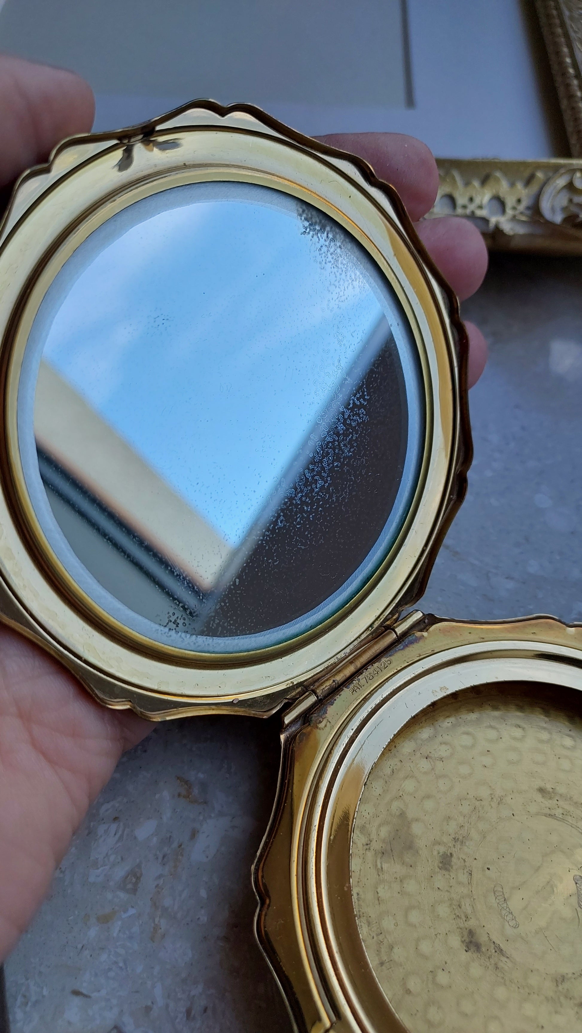 Stan bardzo obry — lusterko z drobnymi śladami czasu, mechanizm otwiera się płynnie, a wzór na wieczku pozostaje wyrazisty i nasycony. Z tyłu widoczne są przetarcia na złocistej powłoce.