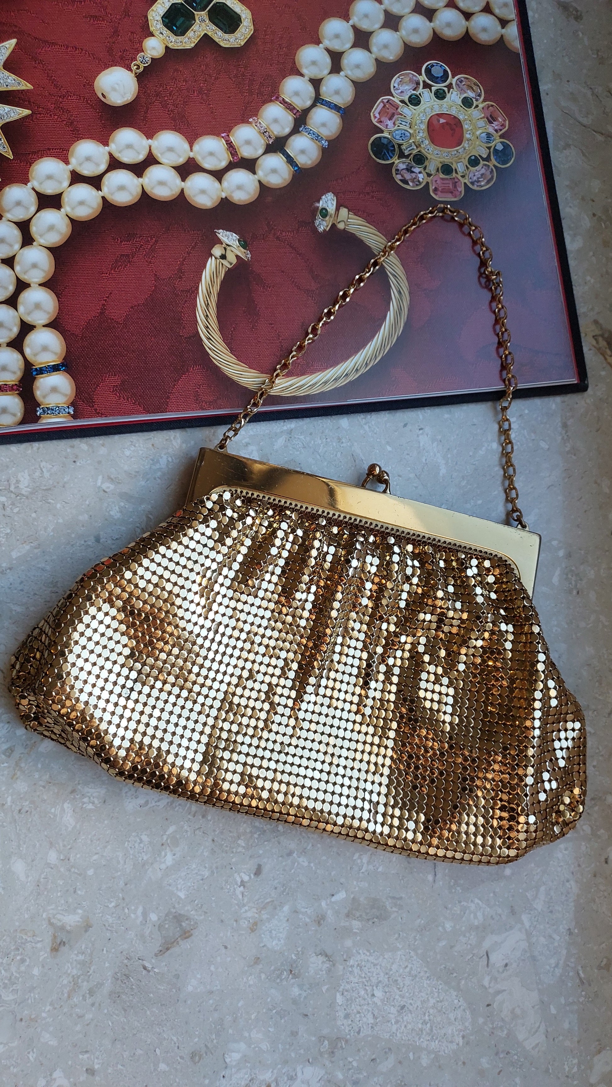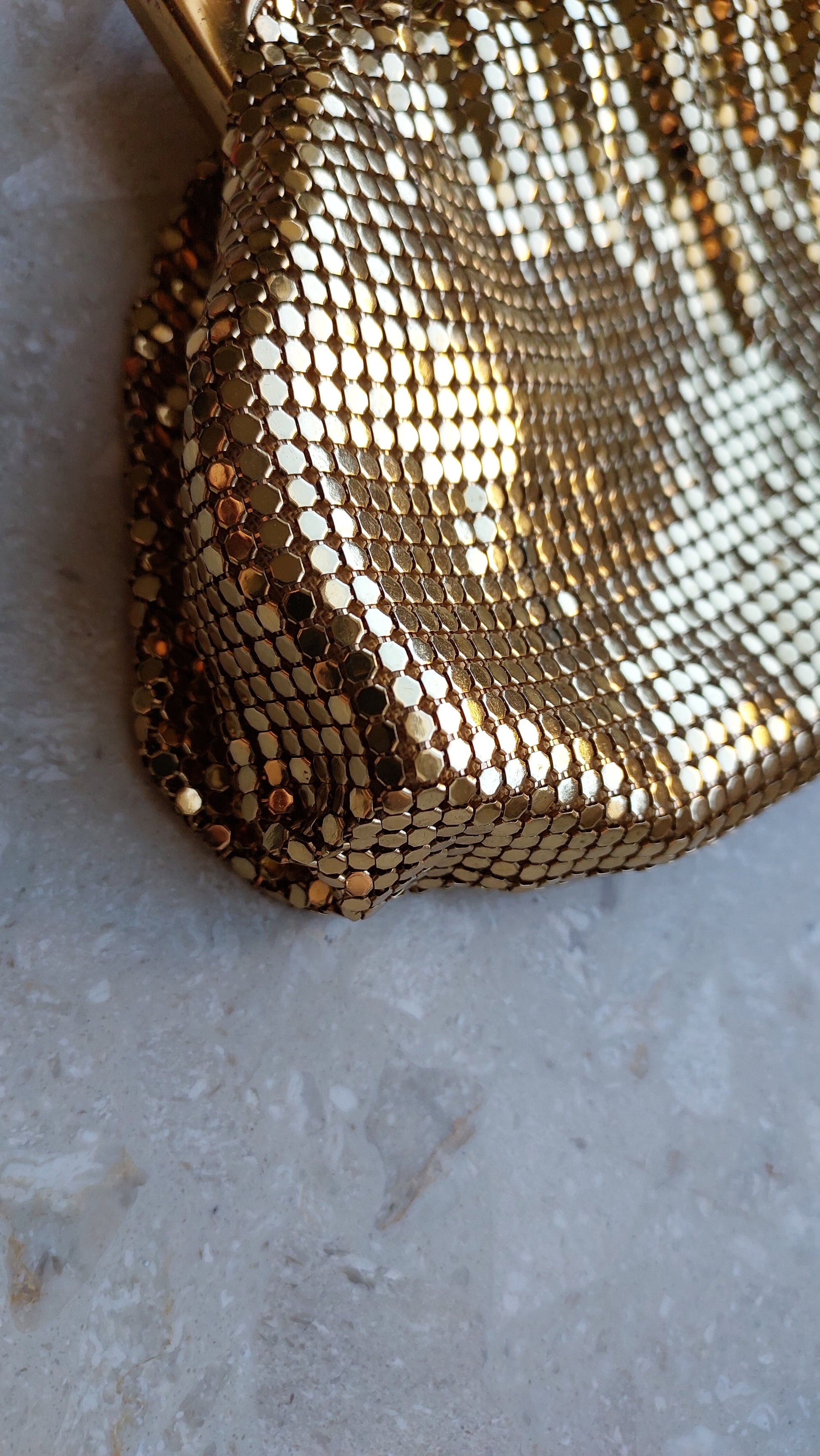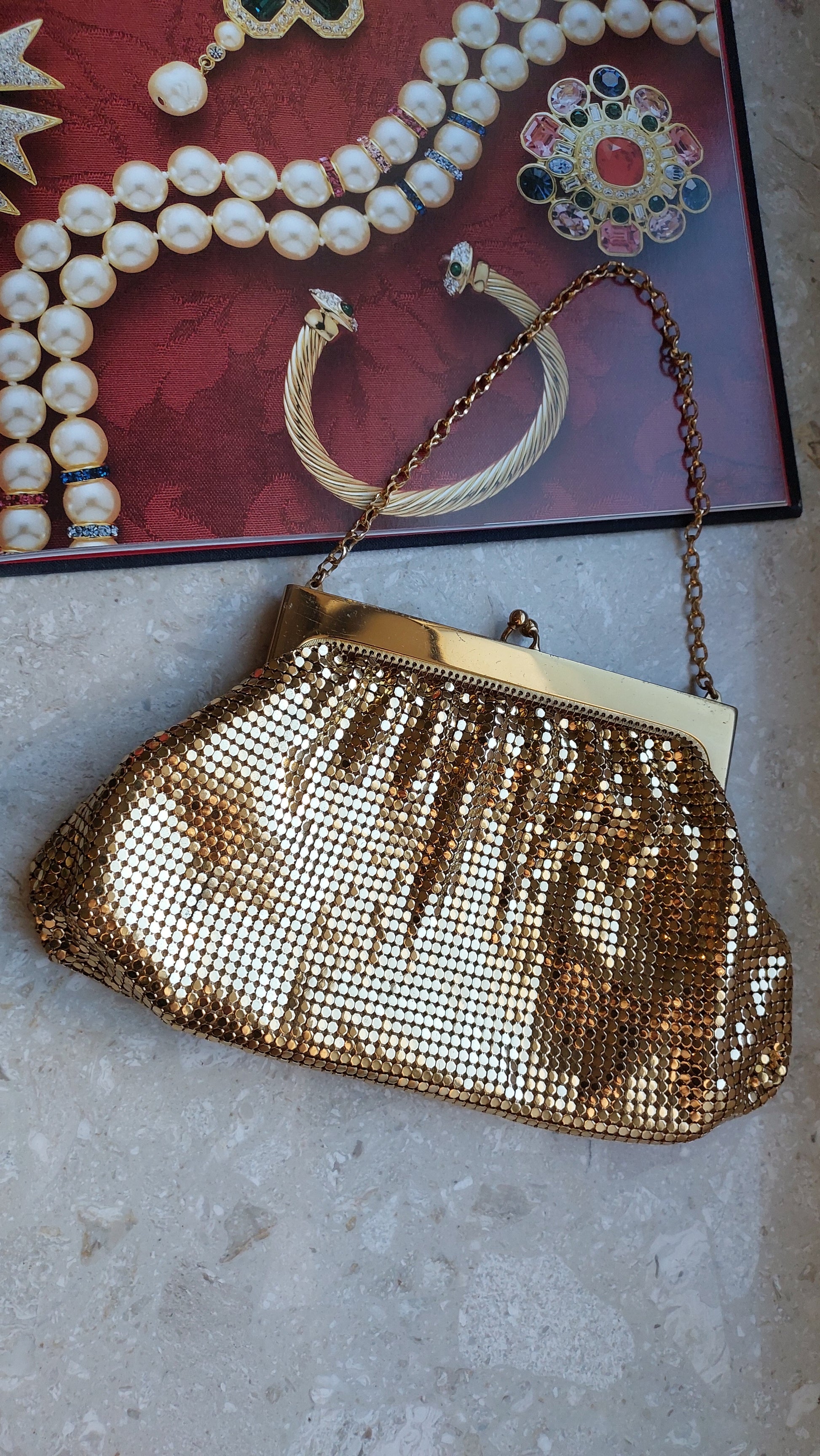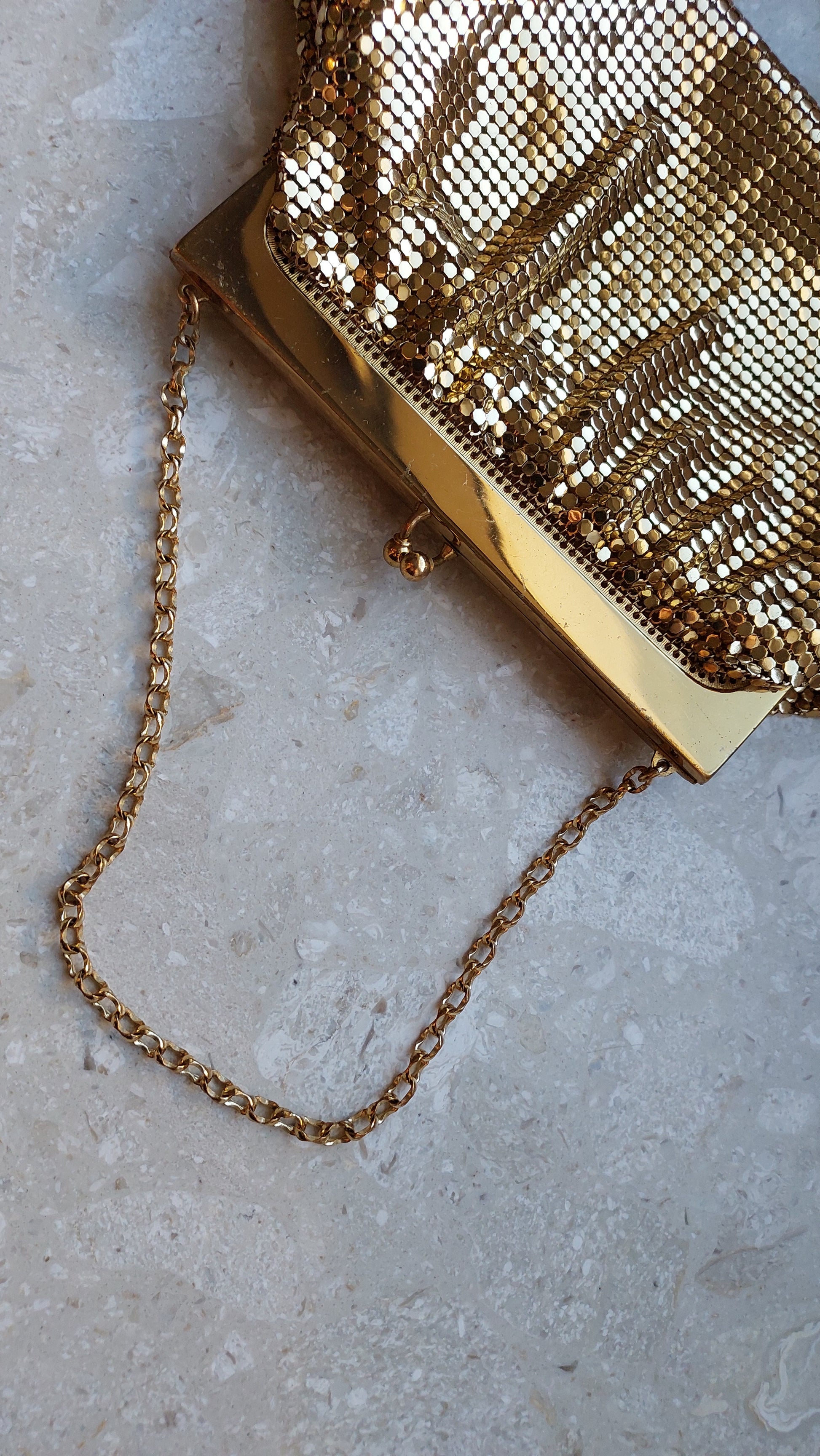 Ta szykowna torebka vintage od Whiting & Davis to prawdziwy symbol retro glamour i wyszukanego smaku. Wykonana jest z kultowej metalowej siateczki, która stała się znakiem rozpoznawczym marki. Złociste wykończenie nadaje jej wyjątkowy urok, tworząc efekt subtelnego, migotliwego blasku.