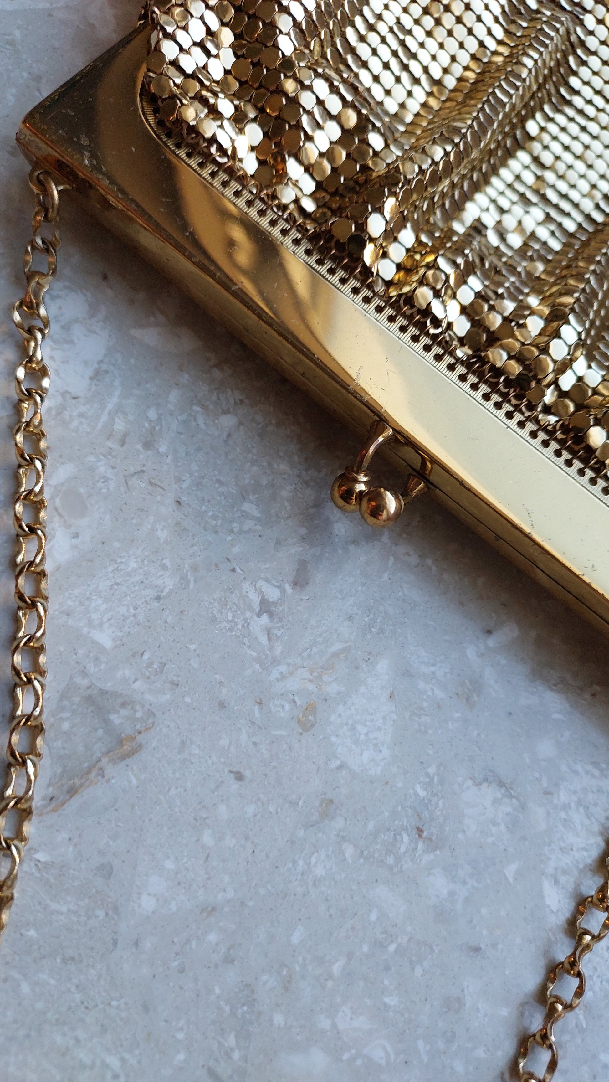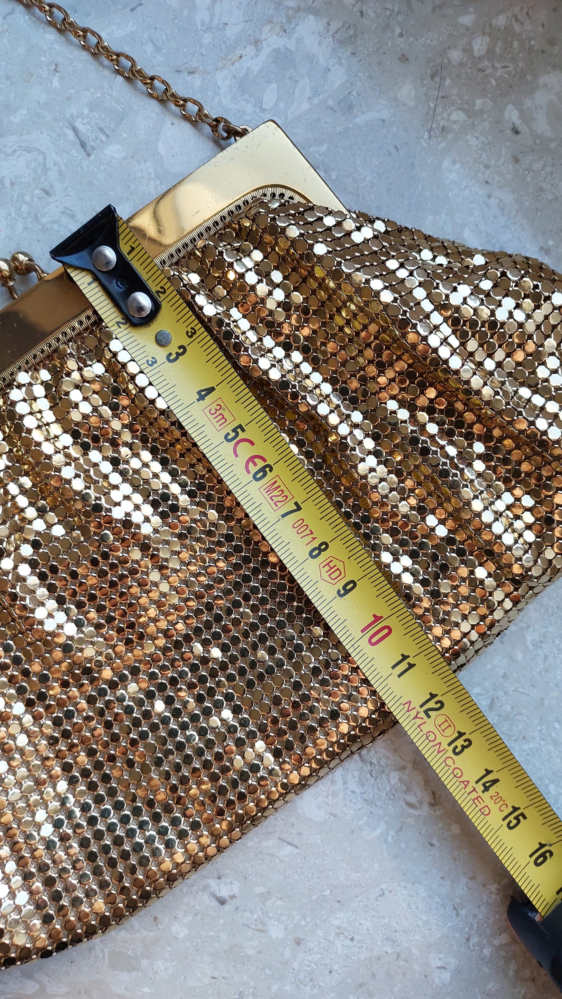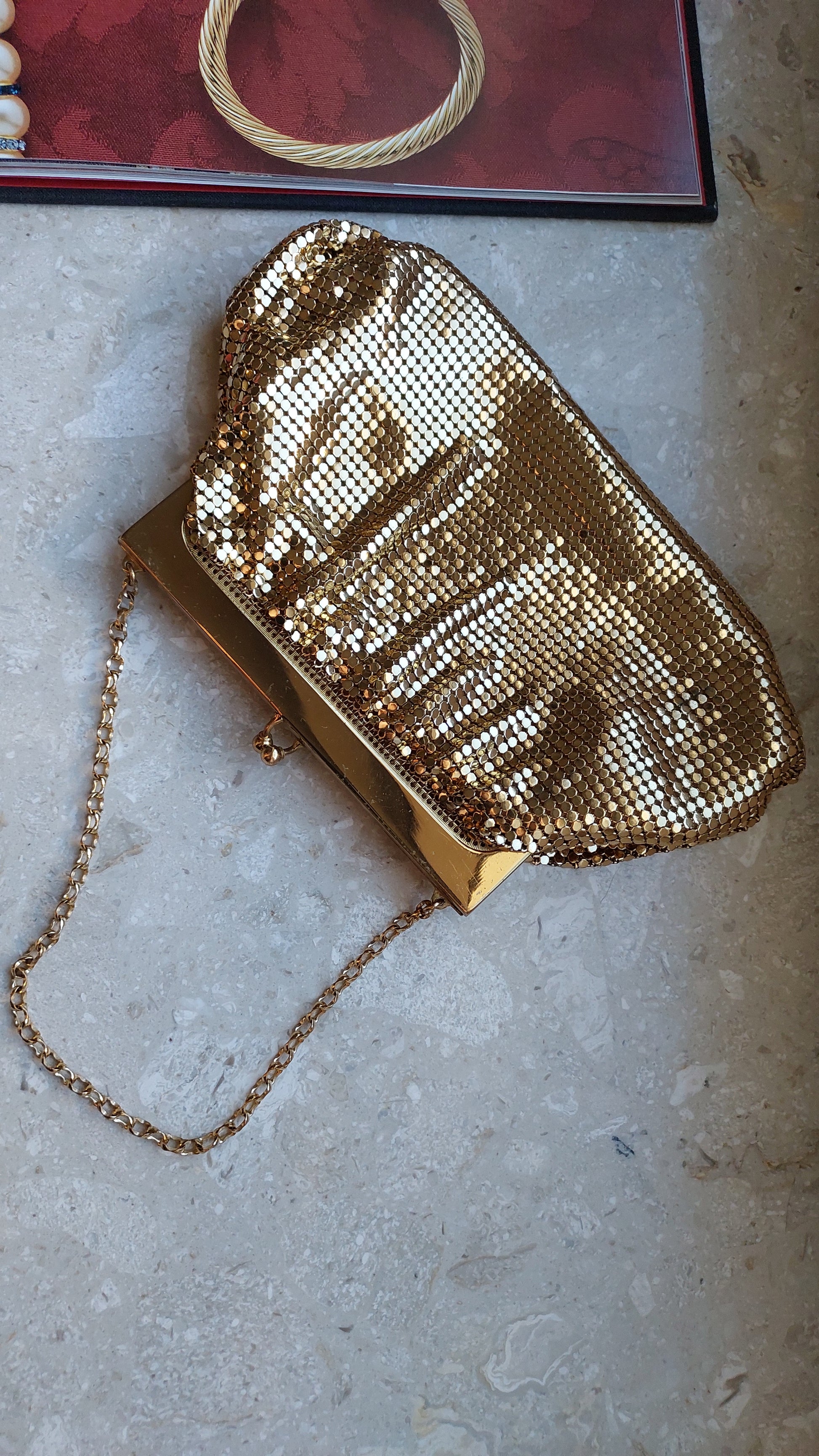 Ta szykowna torebka vintage od Whiting & Davis to prawdziwy symbol retro glamour i wyszukanego smaku. Wykonana jest z kultowej metalowej siateczki, która stała się znakiem rozpoznawczym marki. Złociste wykończenie nadaje jej wyjątkowy urok, tworząc efekt subtelnego, migotliwego blasku.