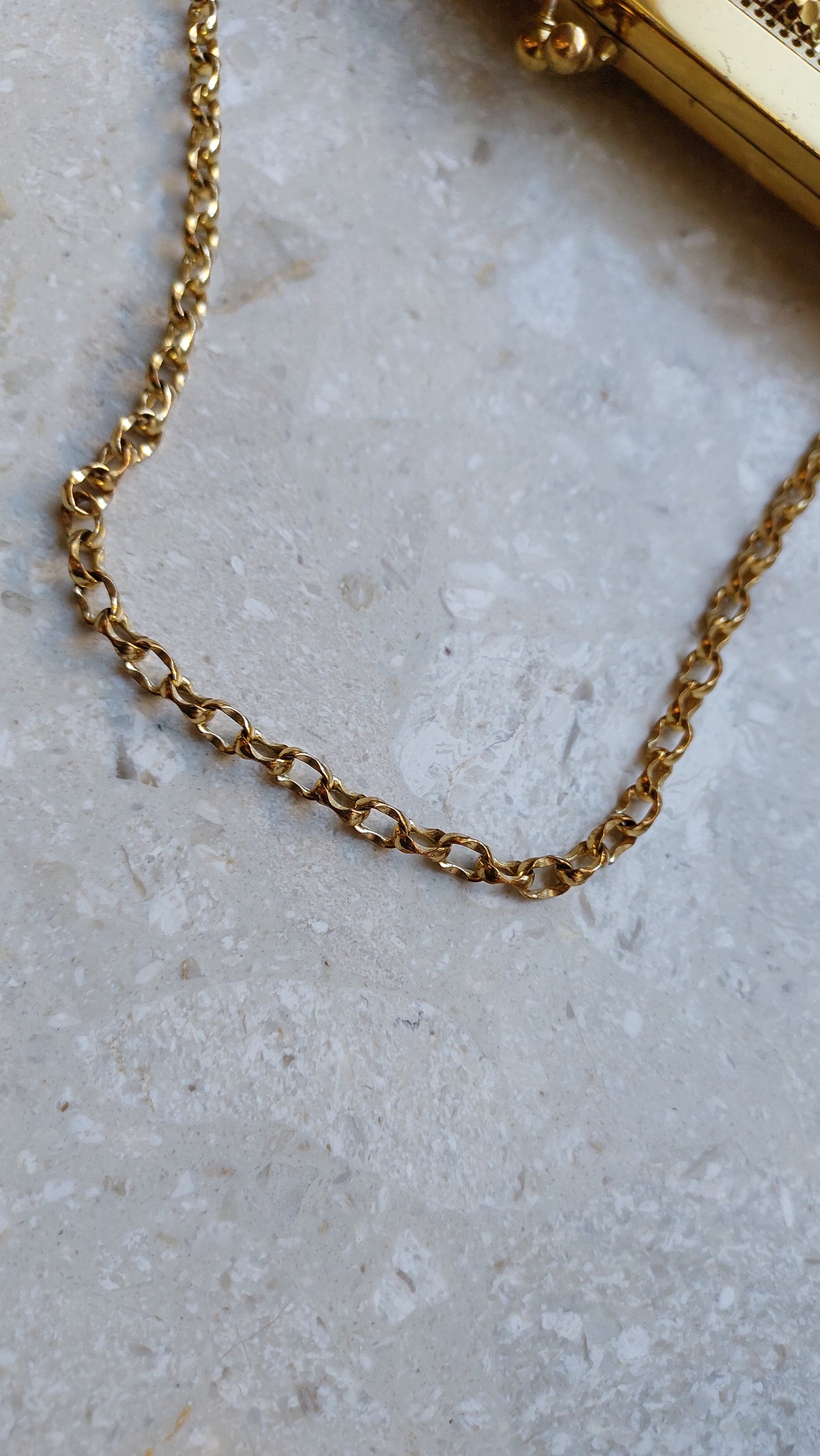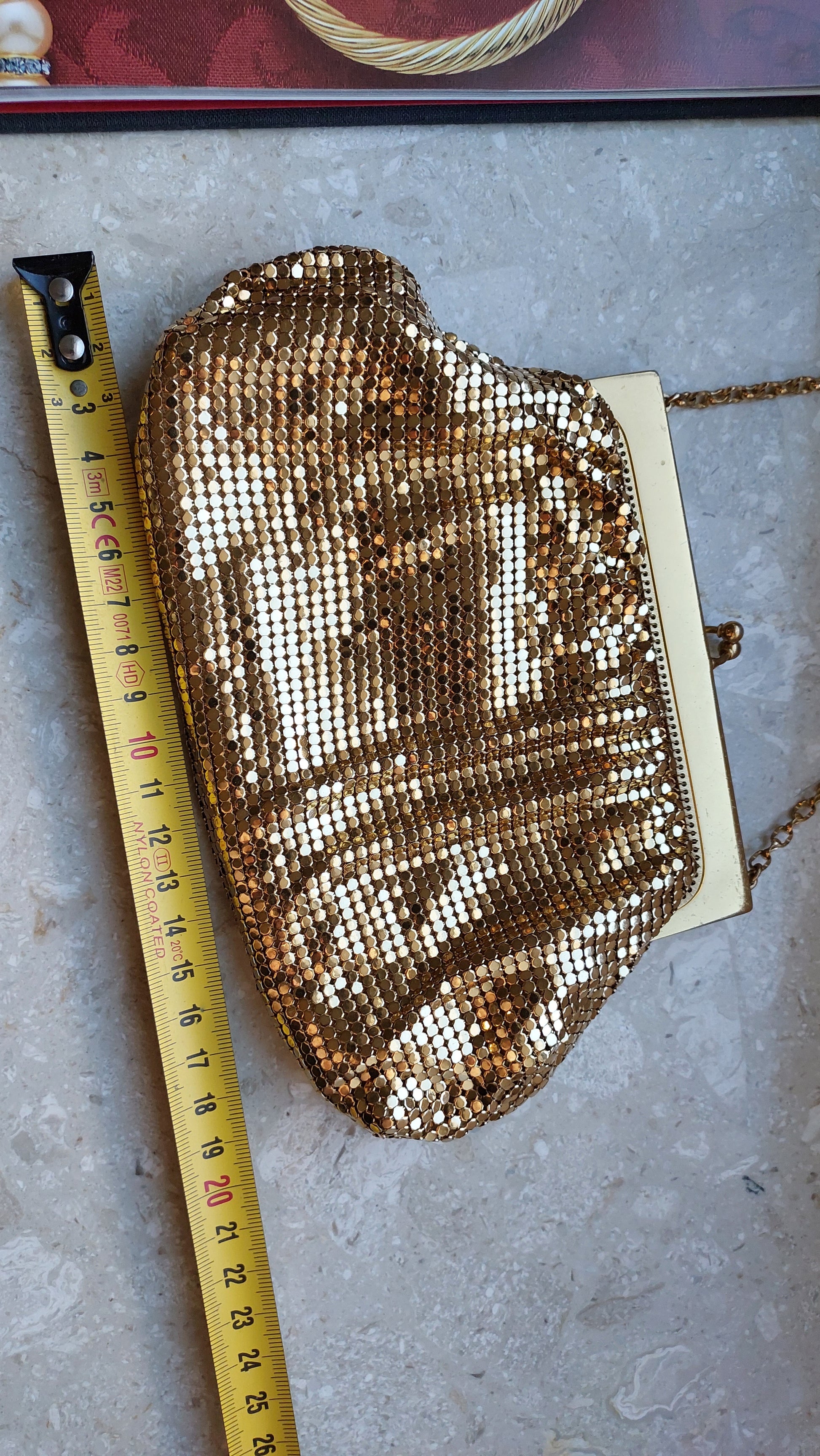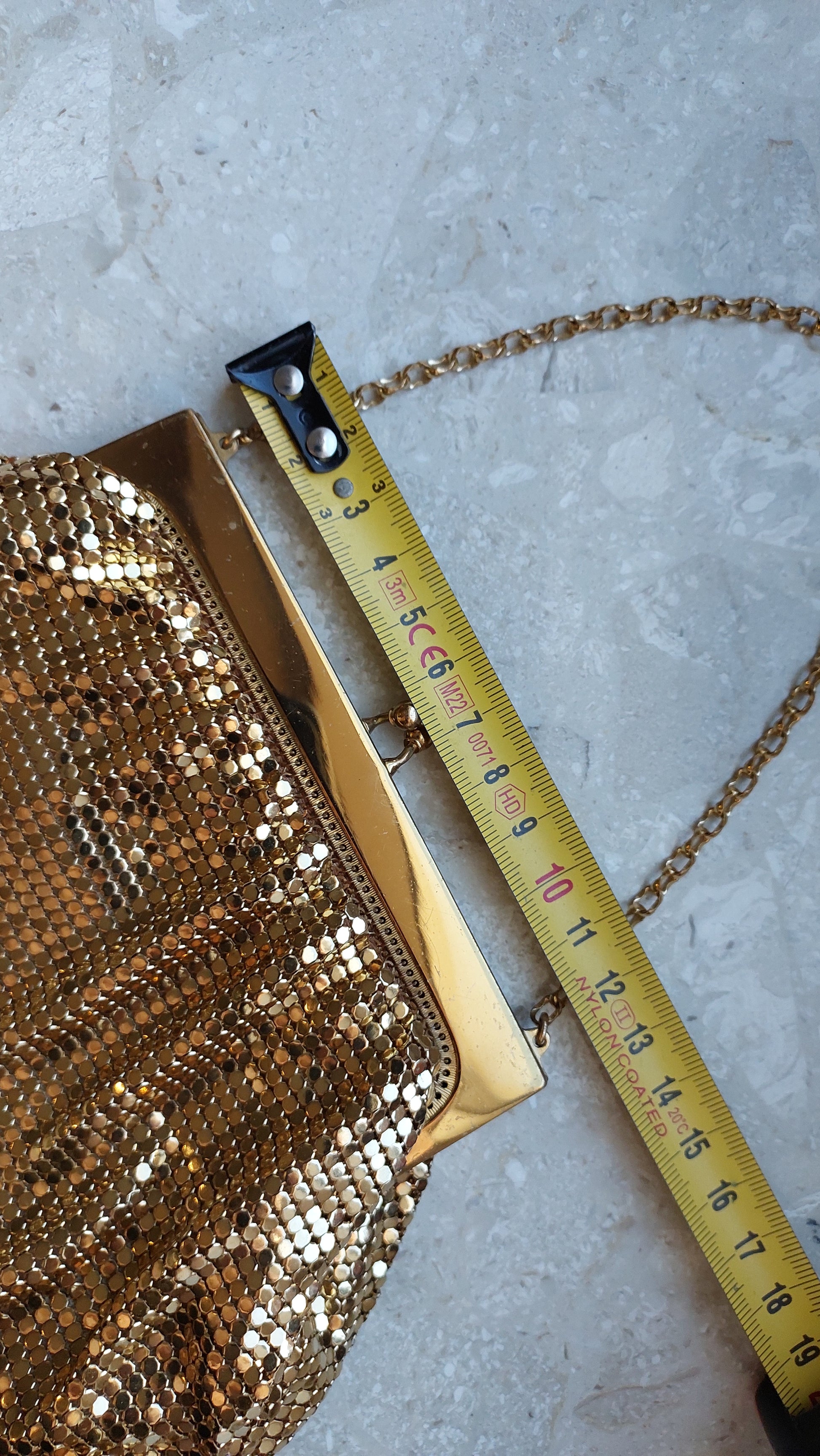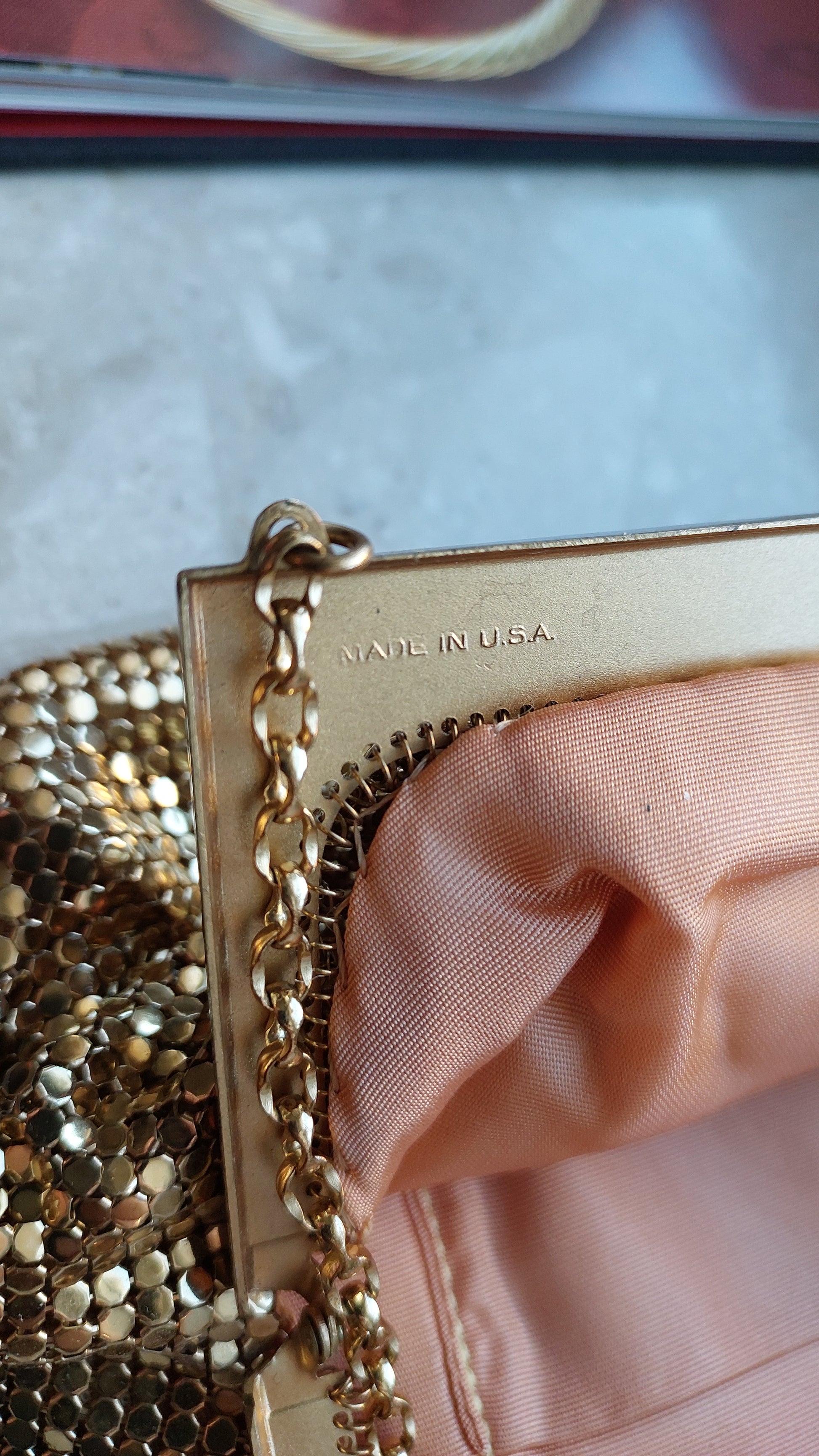 Ta szykowna torebka vintage od Whiting & Davis to prawdziwy symbol retro glamour i wyszukanego smaku. Wykonana jest z kultowej metalowej siateczki, która stała się znakiem rozpoznawczym marki. Złociste wykończenie nadaje jej wyjątkowy urok, tworząc efekt subtelnego, migotliwego blasku.