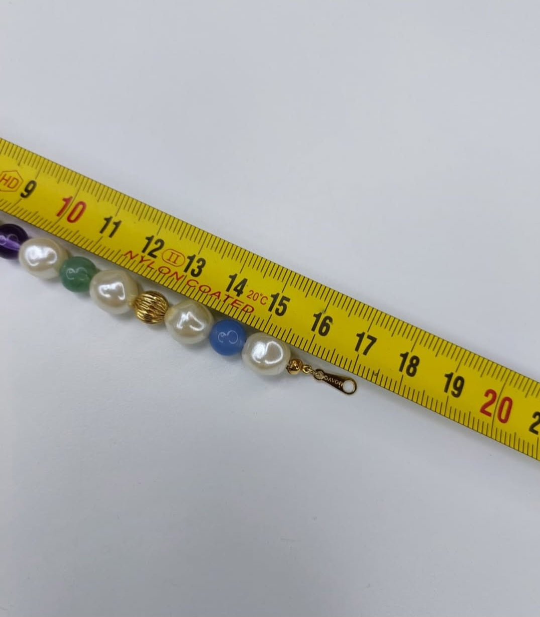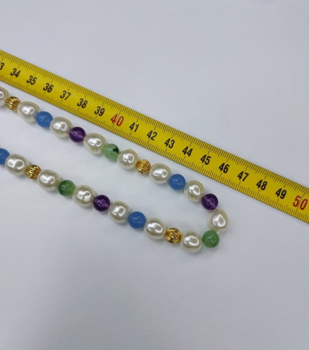 Zestaw vintage Avon, składający się z naszyjnika i bransoletki, wykonanych z perłowych koralików o nieregularnym kształcie, które przeplatają się z kolorowymi koralikami w delikatnych odcieniach błękitu, zieleni i fioletu, a także z żłobionymi koralikami w złotym kolorze.