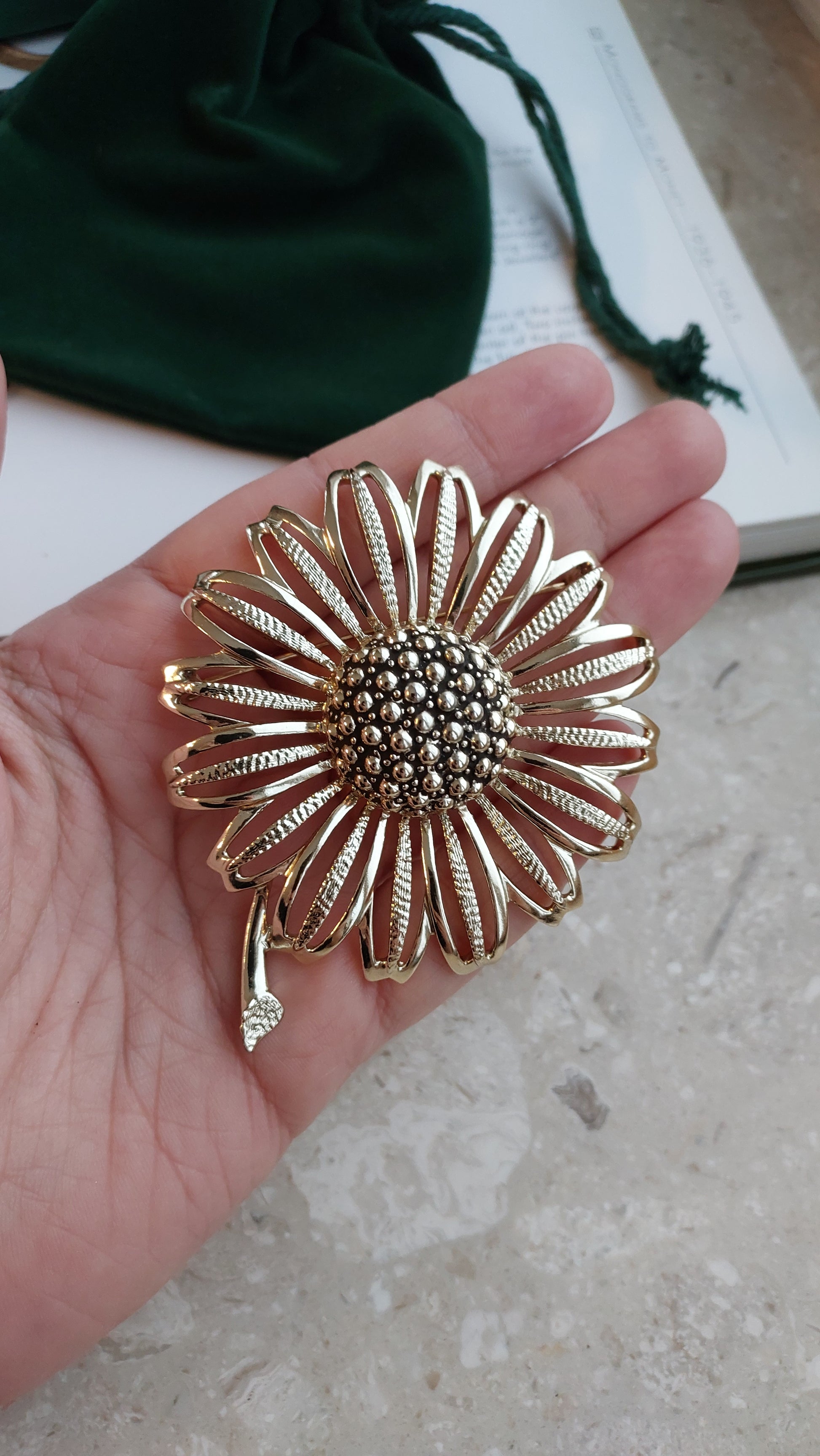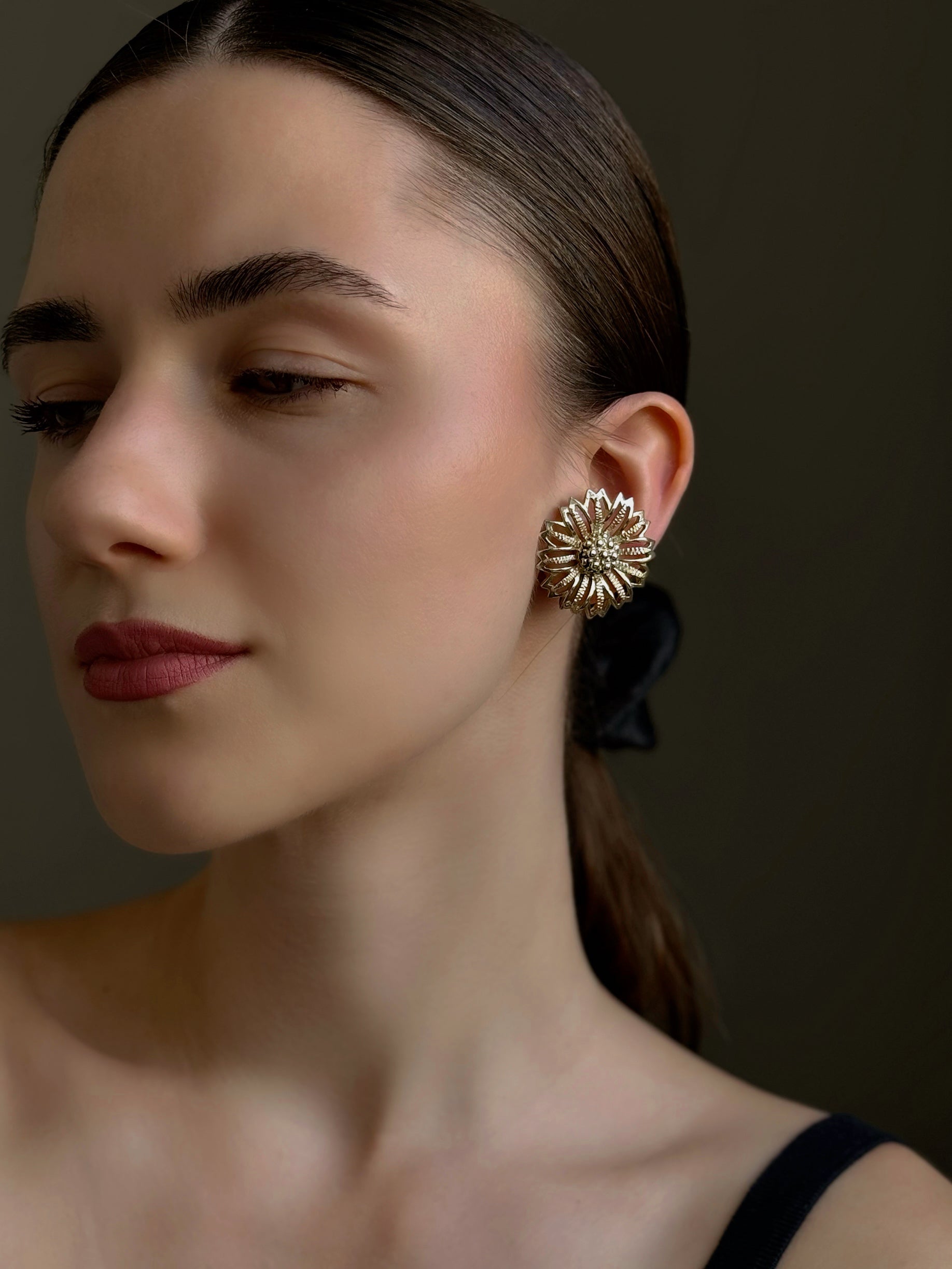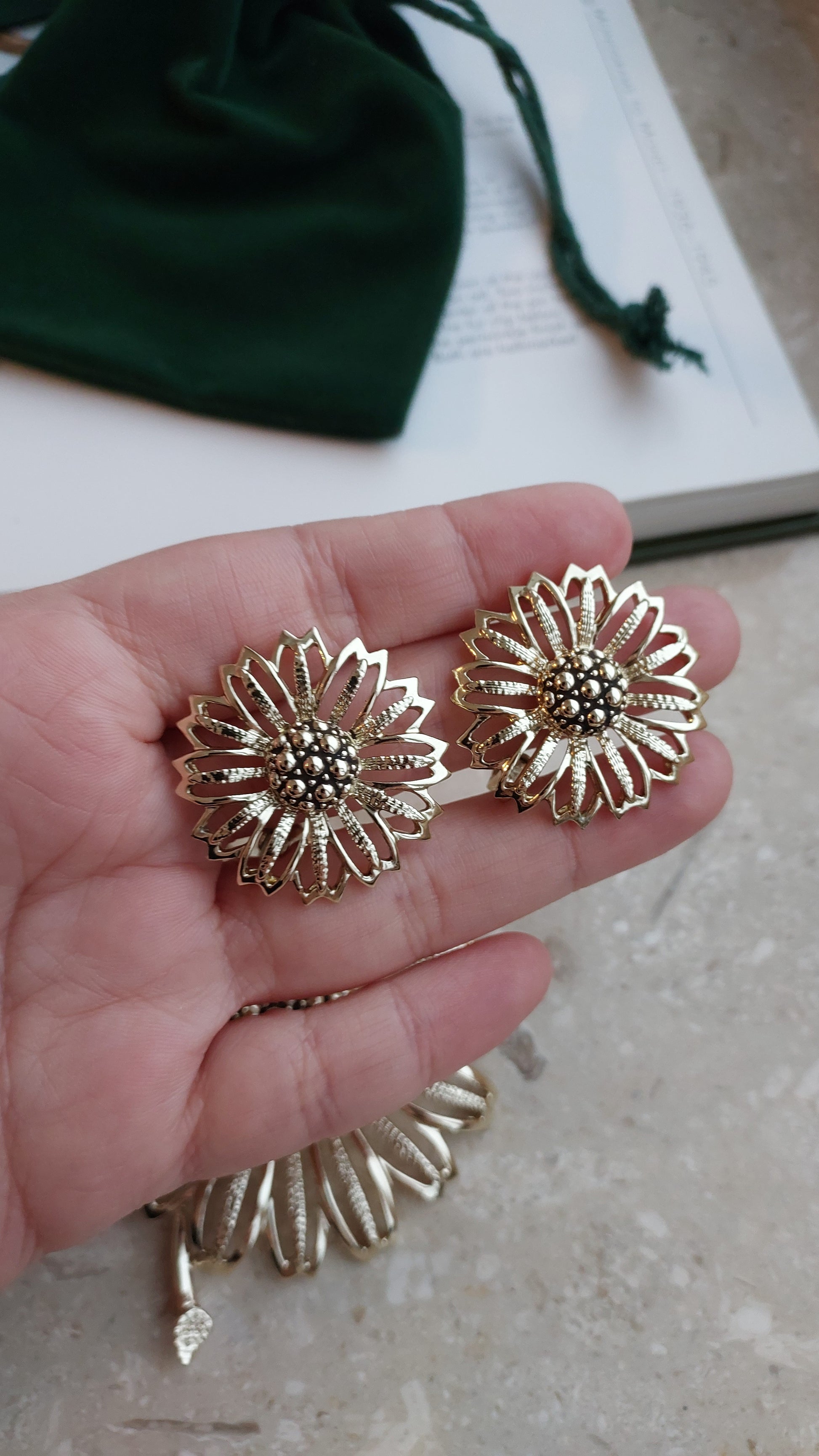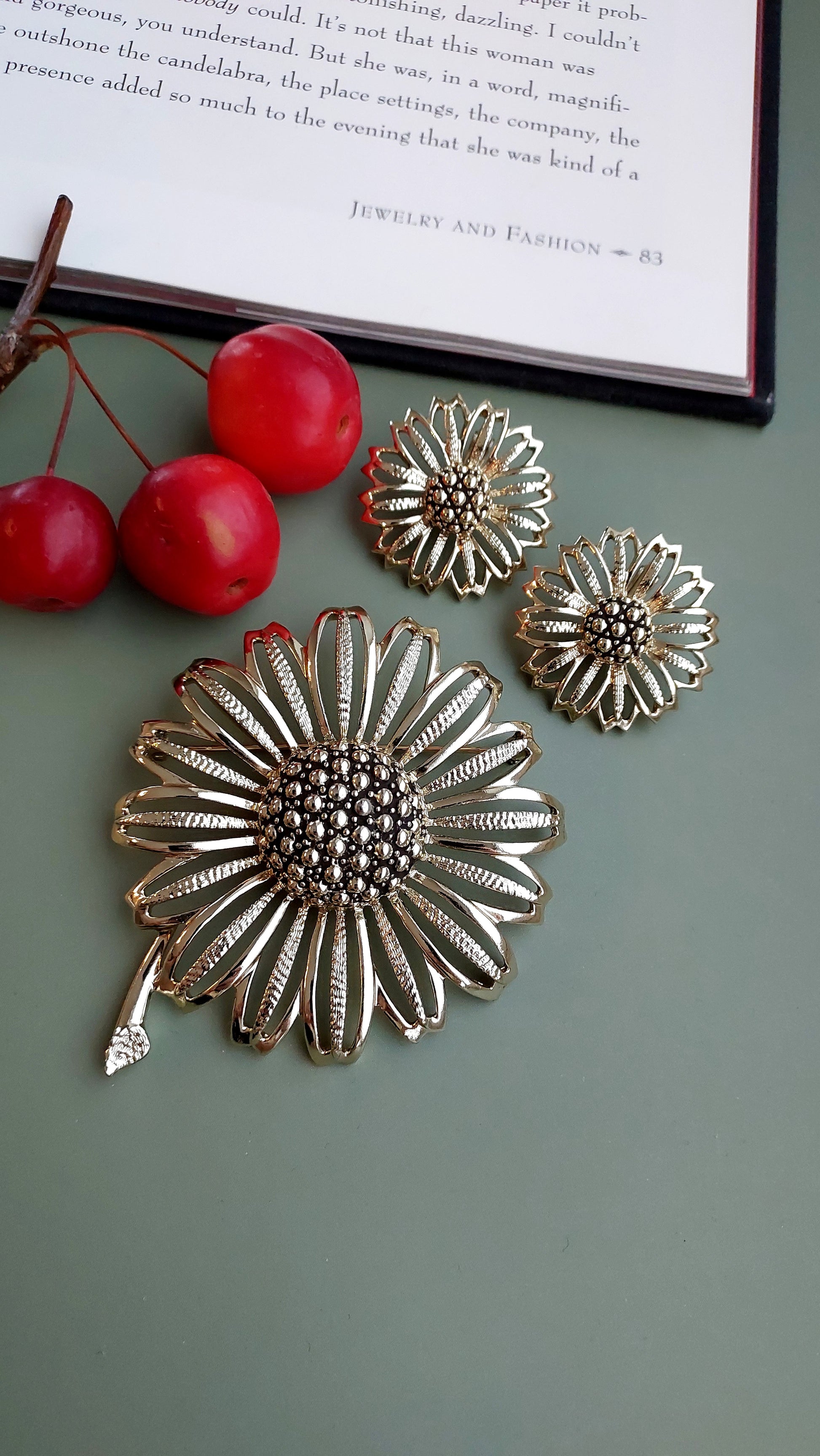 Broszka i klipsy mają kształt kwiatów z ażurowymi płatkami i wypukłym, teksturowanym środkiem. Złocisty blask i gra faktur nadają kompletowi wyrazistości i dekoracyjności.